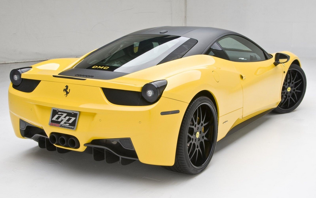 La Ferrari 458 Italia Milano transformée par DMC pour le SEMA Show se présente sous une carrosserie faite de fibres de carbone, bi-teintes, de couleur jaune avec un toit tout de noir vêtu et des rétroviseurs en carbone.
