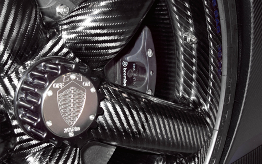 La voiture est assise sur des roues sport monopièce et entièrement faites en fibres de carbone, une première dans l’industrie pour une voiture dite de série.