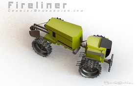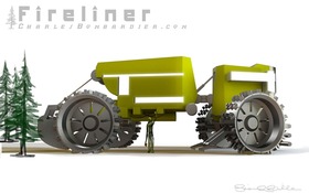 Le Fireliner est équipé d’un énorme bélier hydraulique qui lui permet de plier et pousser les arbres sur son chemin. Une lame située à l’arrière du véhicule tasse les arbres de chaque côté du véhicule. Des chargeurs (loaders) pourraient suivre le FireLiner et pousser les arbres tombés de chaque côté de la tranchée afin de les récolter. Le véhicule est assez gros, donc il devrait être livré en 3 blocs distincts (moteur, cabine et roues). Peut-être qu'il pourrait même s’assembler automatiquement si on l’équipe d’un bras manipulateur hydraulique…