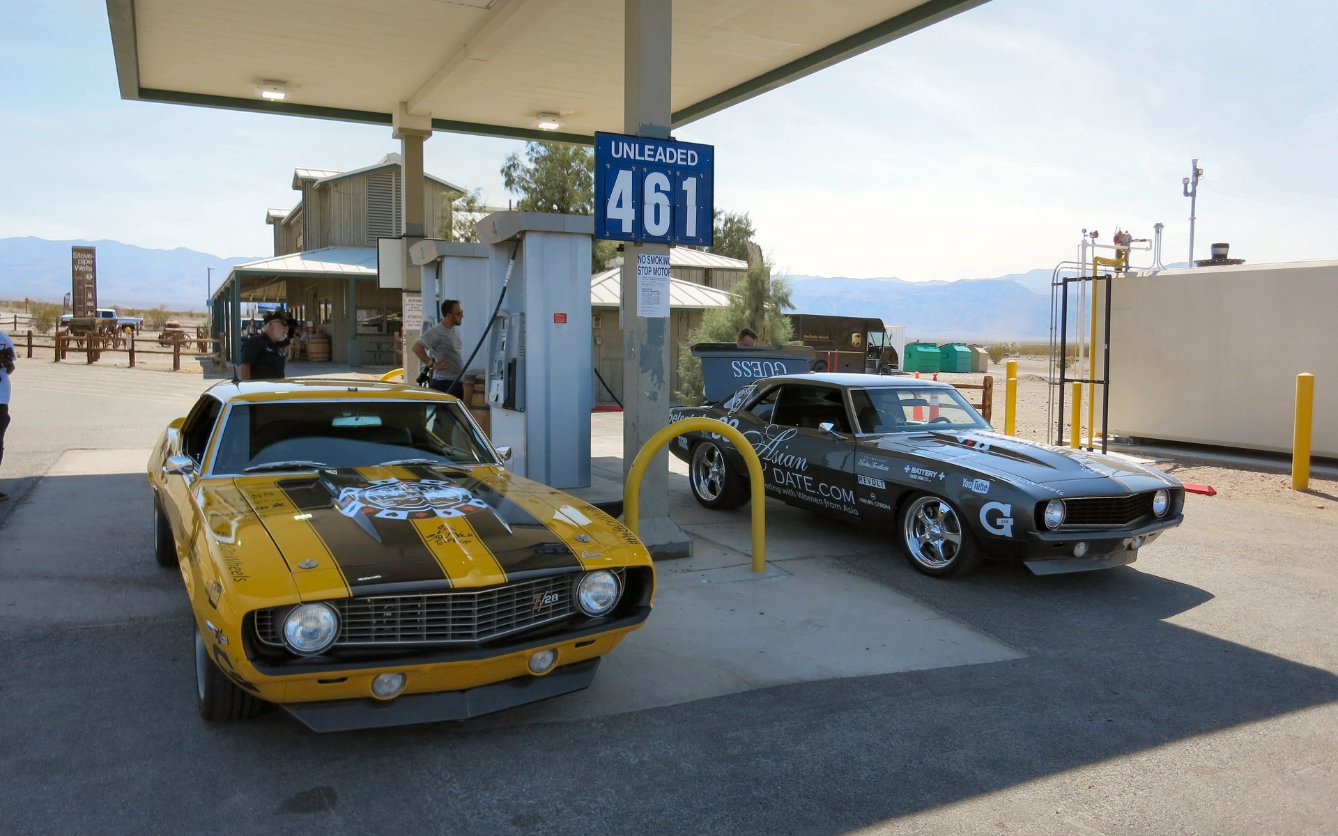 Eh bien voilà. Je deviens le tout premier conducteur de l’histoire du Gumball 3000 à se faire arrêter non pas pour un excès de vitesse, mais pour le contraire absolu. Cela dit, ce n’est pas de ma faute. Je suivais Anthony dans sa propre Camaro 1969 au moment de l’infraction alléguée. Pour ventiler sa frustration quant à la façon dont notre convoi avait été traité par lesdits rangers depuis que nous avons quitté Stovepipe Wells, Antony roulait systématiquement à 20 mi/h sous la limite de vitesse, dans l’espoir que les forces de l’ordre abandonneraient leur plan consistant à nous servir d’escorte non officielle. Je découvre un peu plus tard qu’Anthony s’est fait arrêter à son tour un mille plus loin, ce qui fera de lui le deuxième pilote escargot dans les statistiques du Gumball. Ce sera la seule fois où l’une ou l’autre de nos Camaro aura été interceptée par les forces constabulaires dans notre voyage épique de Stockholm à Las Vegas.