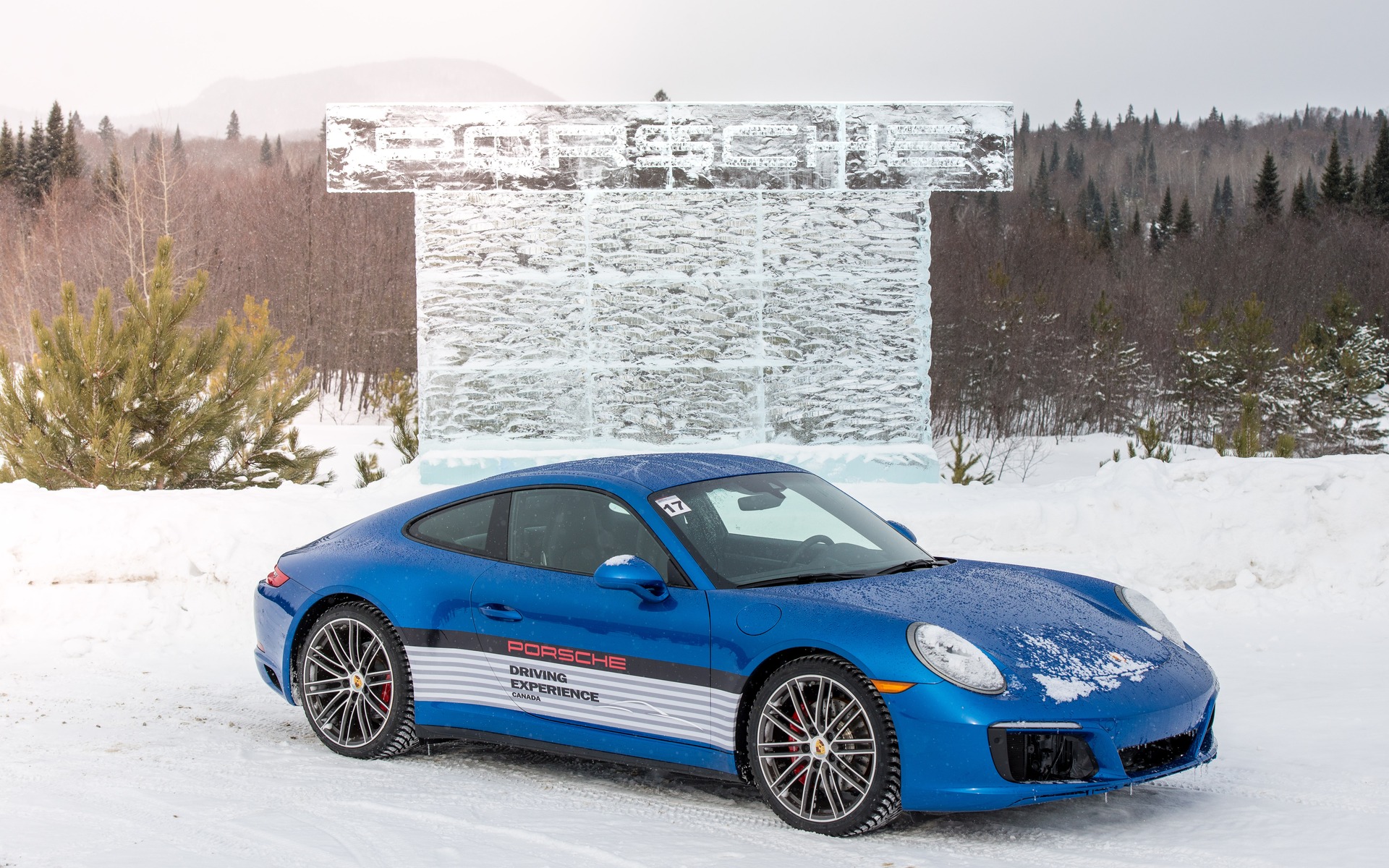 Ensuite, c’est au tour de l’apprentissage d’une technique avancée, qui consiste à profiter de la transmission intégrale de la Porsche 911 4S pour tourner abruptement. Si la courbe est vers la droite, on arrive en ligne droite à bonne vitesse, toujours sur la glace, on lâche l’accélérateur, on tourne le volant à gauche, et on donne un coup de frein pour être déporté du côté vers où le volant est tourné. Une fois l’auto alignée avec la sortie de virage, on met les gaz, et le système quatre roues motrices s’occupe de nous remettre sur le droit chemin.
