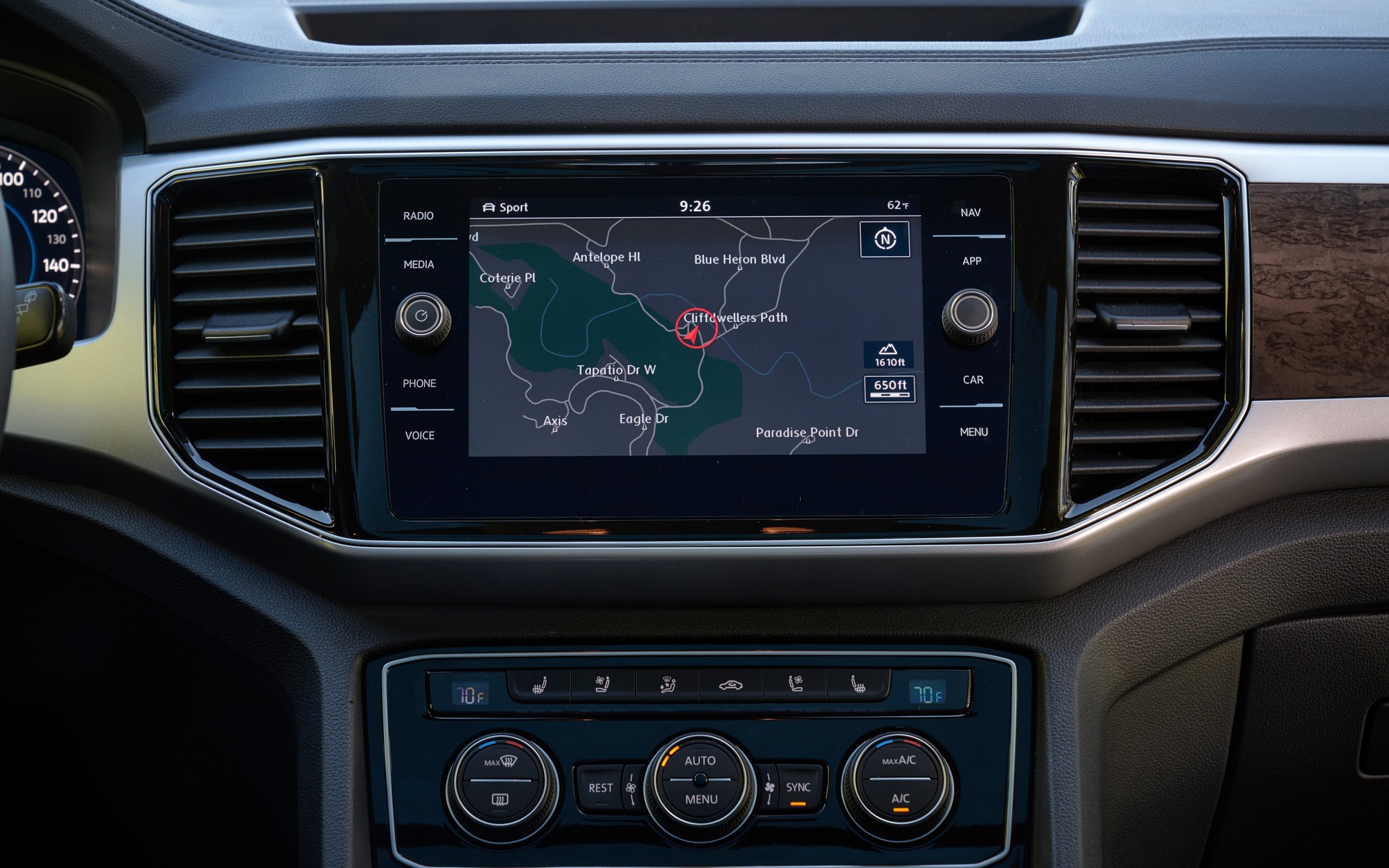 D’aucuns trouvent que le style de l’Atlas manque de vitalité. C’est une question de goût et, personnellement, après l’avoir côtoyé une journée, je commençais à lui trouver un certain charme! Dans l’habitacle, les designers ont repris les thèmes déjà vus sur les autres produits Volkswagen, ce qui fait qu’on ne nage pas dans l’originalité, mais plutôt dans la conformité. Certains plastiques m’ont paru quelque peu bas de gamme et les plaquages de faux bois n’étaient pas très convaincants. Le grand écran central, par contre, est bien intégré au véhicule et la clarté de ses images ne fait pas de doute. Côté techno, l’Atlas possède l’App-Connect qui intègre l’Apple CarPlay, Android Auto et le MirrorLink permettant d’utiliser l’interface de son téléphone sur l’écran.