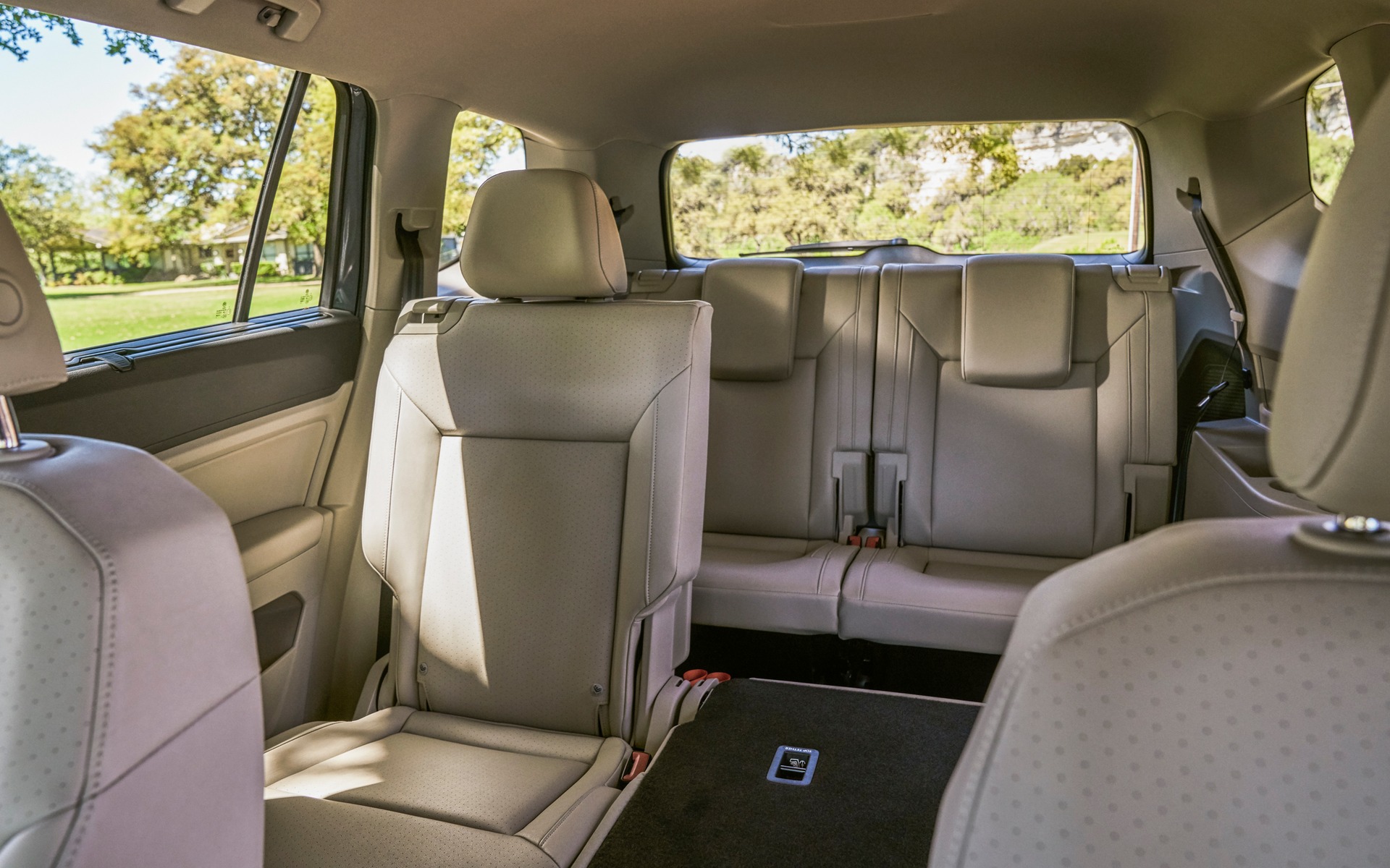 Comme d’habitude chez Volkswagen, les sièges avant sont juste assez fermes et font preuve de confort même après plusieurs heures. Ceux de la deuxième rangée sont corrects et la troisième rangée peut accueillir deux adultes presque en tout confort. Le comédien Antoine Bertrand et l’homme fort Hugo Girard seraient toutefois très malheureux s’ils devaient y prendre place ensemble. Et même tout seul… On accède à cette troisième rangée en faisant coulisser les sièges de la deuxième rangée, même si un siège de bébé y est installé. Les versions haut de gamme Highline et Execline pourront être équipées du groupe Capitaine qui fournit deux sièges capitaines à la deuxième rangée au lieu d’une banquette. Ainsi doté, l’Atlas devient un six places. Les deux autres livrées, Trendline et Comfortline reçoivent d’office la banquette, offrant ainsi sept places.
