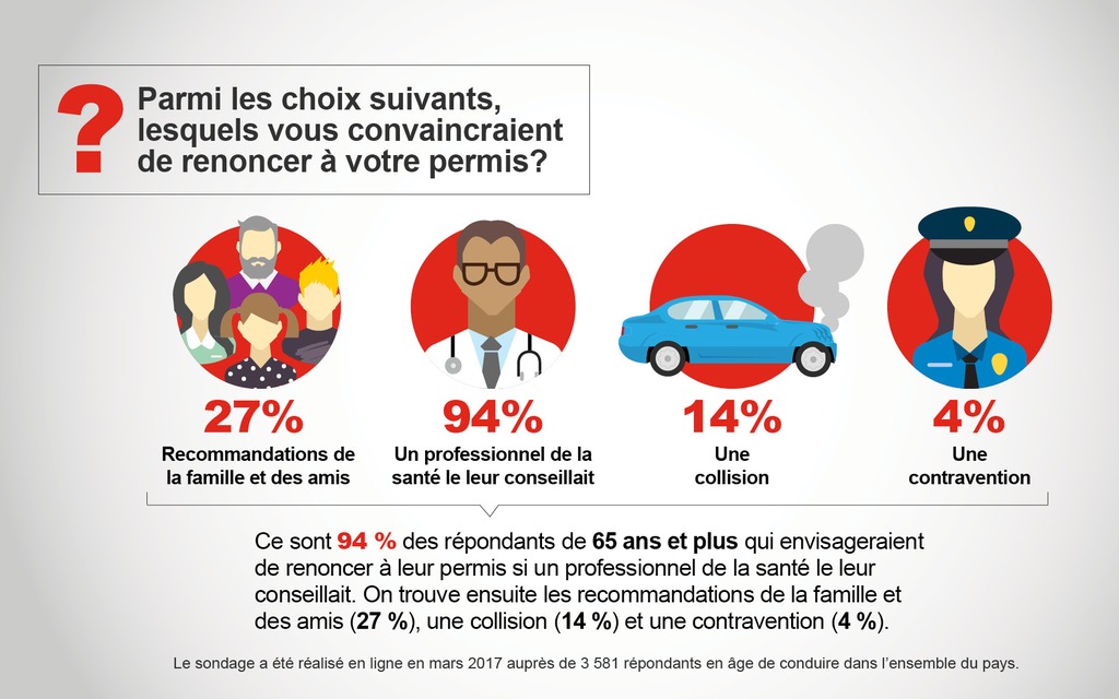Lorsque le moment est finalement arrivé, quels sont les facteurs qui inciteraient les personnes âgées à abandonner leur permis? Selon les répondants de 65 ans et plus, les trois principaux arguments sont les recommandations d'un professionnel de la santé (94%), les inquiétudes des parents et amis (27%) et une collision (14%).