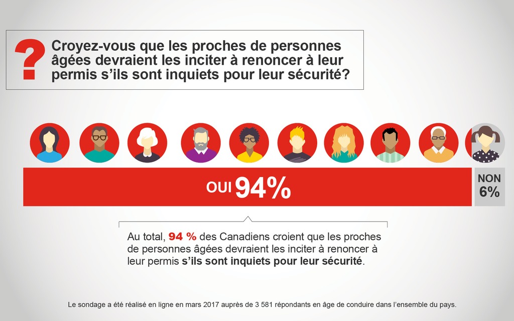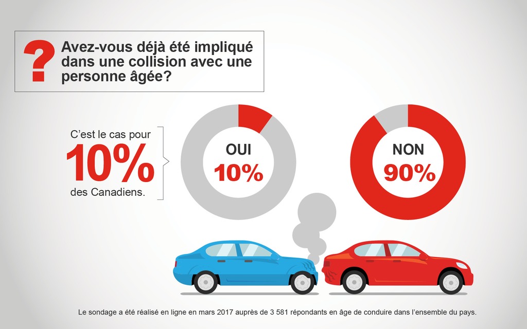 Lors d'un récent sondage de State Farm Canada un répondant sur dix a mentionné avoir été impliqué dans une collision avec un aîné. Bien que 94% des gens interrogés croient qu'il faudrait parler aux membres de leur famille âgés pour les inciter à renoncer à leur permis s'ils craignent pour leur sécurité et celle des autres usagers de la route, seuls 2% des aînés affirment avoir eu cette conversation avec un de leurs proches.