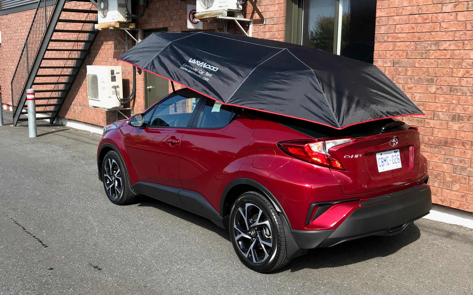 Nous voilà au bureau, réunis autour de cette curieuse boîte. Après tout, on parle ici d’un parapluie pour voiture… Aussitôt le parapluie déballé, nous rechargeons la petite batterie de 12 volts qui alimente la patente et on s’empare de la première voiture que nous avions sous la main, un Toyota C-HR 2018.