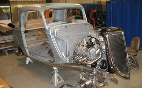 Pour cette édition 2009 du célèbre SEMA Show de Las Vegas, les ingénieurs de la division ‘moteurs’ de Ford, ont eu l’heureuse idée de tuner, avec la complicité des compagnies Detroit Street Rods et Experi-Metal, un modèle Ford3-Window Coupe 1934 qui n’est pas sans rappeler les beaux Hot Rod de cette époque.