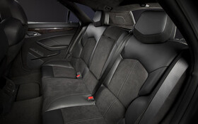 À l’intérieur, la familiale sport CTS V en version d’exposition est garnie de cuir noir exclusif avec des garnitures contrastantes en Alcantara. La partie supérieure du tableau de bord et les panneaux supérieurs des portes sont garnis du même cuir de catégorie supérieure, agrémentés de boiserie en sapelli foncé, tandis que les panneaux inférieurs des portes, les montants, le couvercle de la console, la garniture de pavillon et le moyeu du volant sont ornés de microfibre surpiquée. La voiture d’exposition est dotée de sièges Recaro garnis de cuir noir à grains fins avec empiècements en Alcantara. Les empiècements des sièges sont divisés en leur milieu et accentués par des surpiqûres gris foncé, tandis que le logo V-series est gravé au laser dans les dossiers. Des garnitures contrastantes noires obsidienne ornent la colonne centrale, la console, le volant et les panneaux de portes.