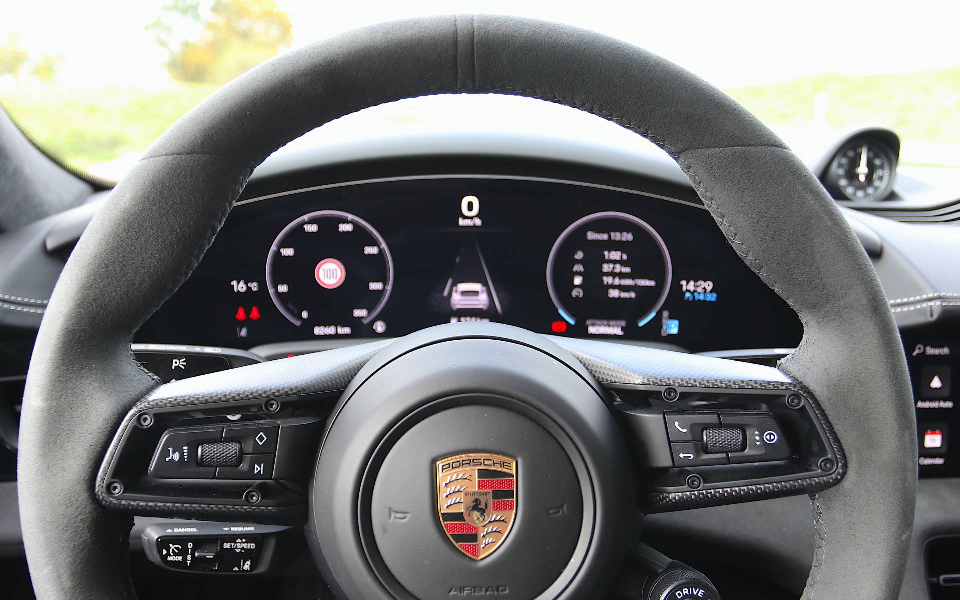 Le modèle que nous avons conduit n’est pas la version Weissach que nous avions pu étrenner sur circuit il y a quelques mois, mais la version normale si tant est qu’un tel qualificatif lui convienne. Comparée à la variante destinée à la piste, la Turbo GT « tout court » dispose d’une banquette arrière et n’arbore pas un aileron arrière aussi proéminent.