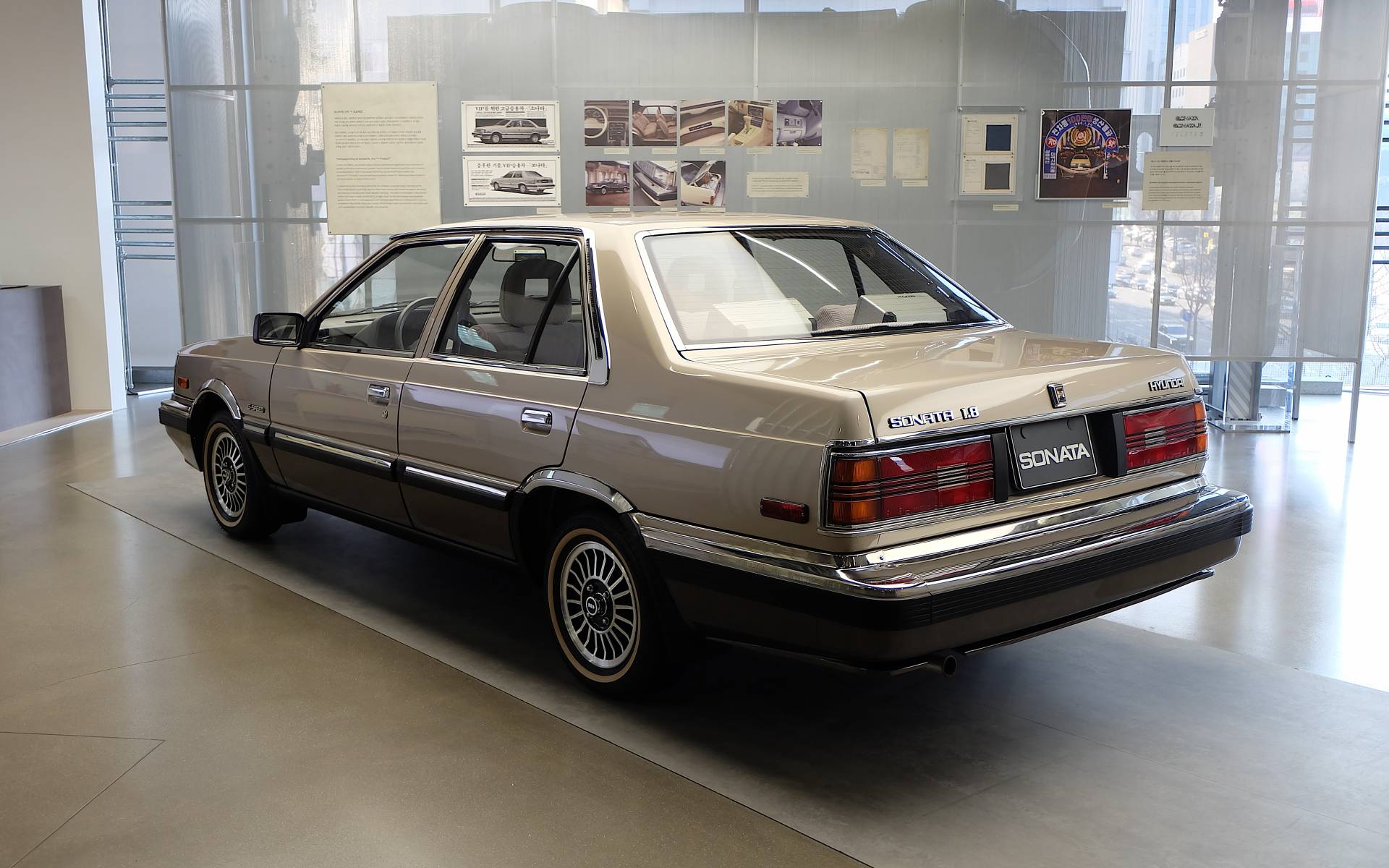 Mais l’étage qui nous a le plus intéressés, c’est celui où l’on retrouvait plusieurs voitures anciennes dans un état de présentation absolument exceptionnel. Notamment une Hyundai Sonata de 1987, une Scoupe de 1992 ou encore une Elantra de 1990. À ces véhicules s’ajoutaient aussi des publicités d’époque ainsi que des documents d’archives retraçant les choix techniques fait par le constructeur.