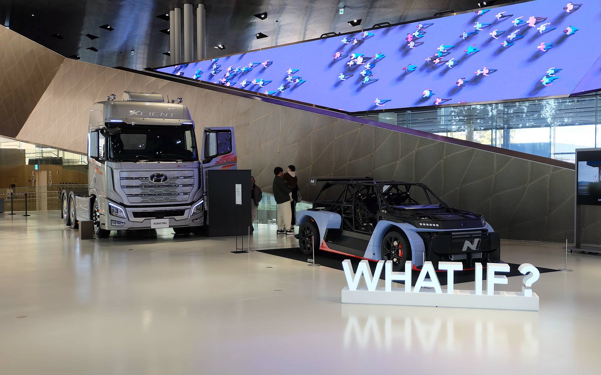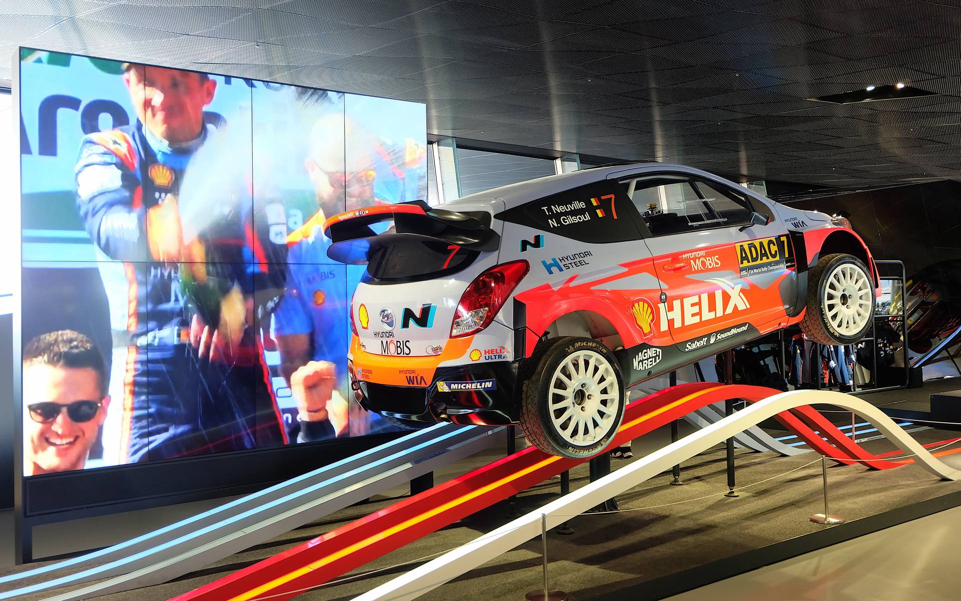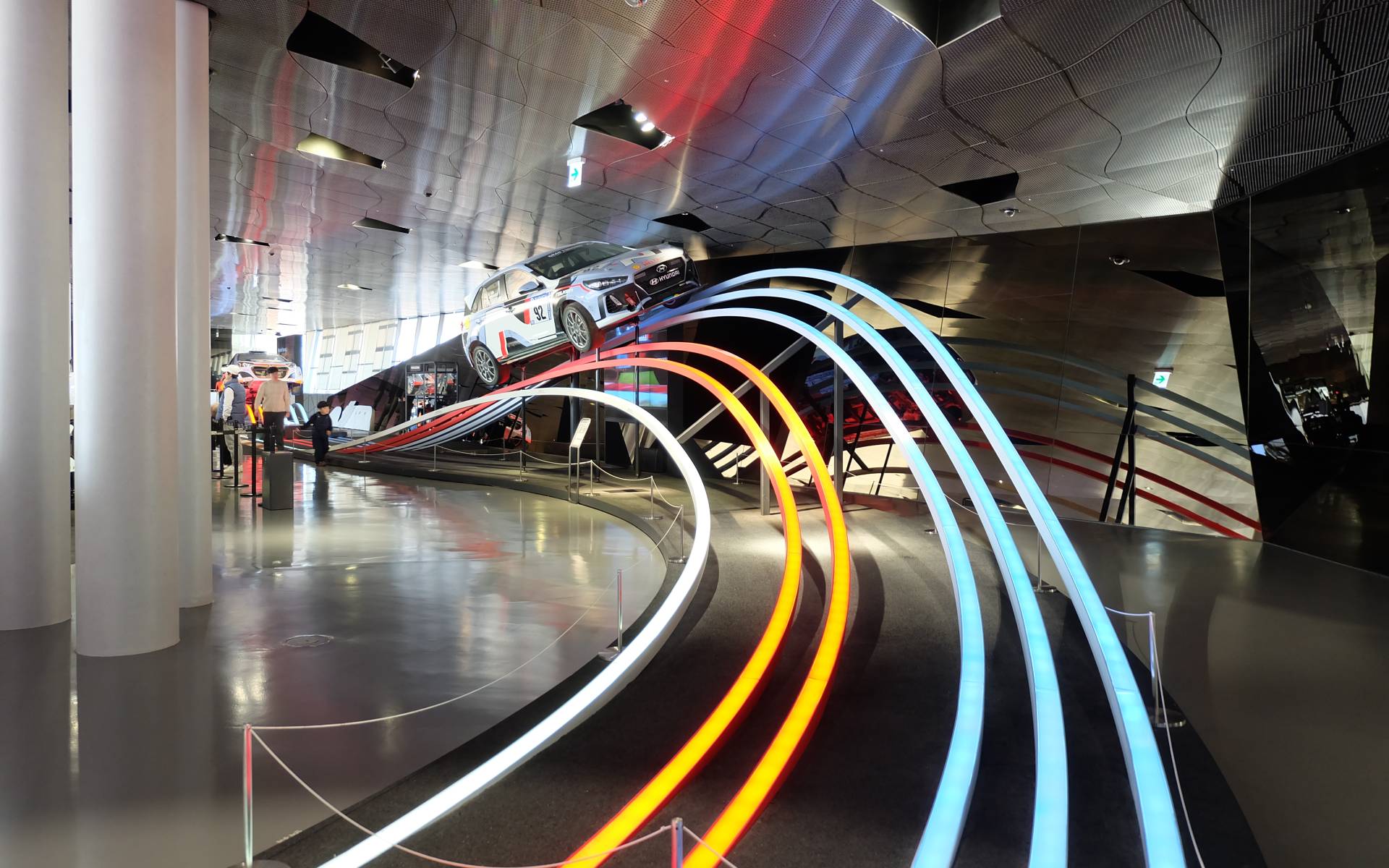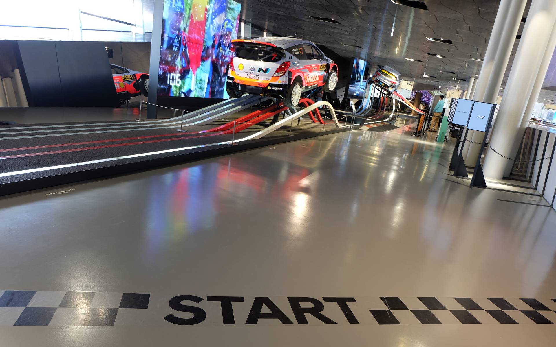 Nous nous sommes consolés avec la section N, un étage qui réunit plusieurs véhicules de course signés Hyundai. Les véhicules sont placés comme sur une piste et mis en valeur par des bandes lumineuses rappelant un manège à sensations. Des voitures ayant participé à diverses courses comme les 24 Heures du Nürburgring ou le Championnat du monde des rallyes (WRC).
