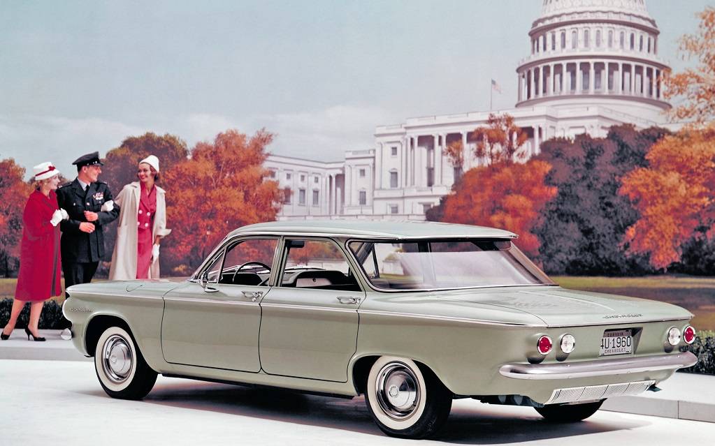 Ah les années 50, synonyme de V8 monstrueux, d’ailerons surdimensionnés et de chromes jetés à la louche! C’est aussi l’époque de la montée en puissance des marques importées, Volkswagen en tête. Certes, leurs parts de marché n’ont rien à voir avec aujourd’hui. Mais ces quelques pour cent commencent à inquiéter les trois grands de Detroit, ou au moins à les irriter. Et la récession de 1958 ne va rien arranger. C’est pourquoi arrivent presque simultanément sur le marché pour le millésime 1960 les compactes Plymouth Valiant, Ford Falcon et Chevrolet Corvair.