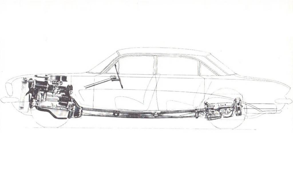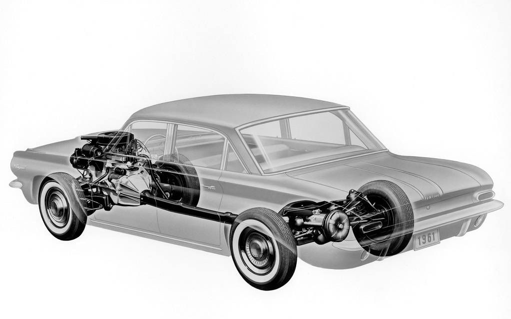Si l’on voulait résumer la Corvair, on pourrait dire qu’elle a pris l’essentiel des solutions techniques de la Beetle et les a mises à la taille américaine. Elle embarque un 6 cylindres à plat refroidi par air installé en porte-à-faux arrière avec un essieu arrière oscillant (swing axle). Si pour Volkswagen, tout cela est connu depuis un bon moment, pour Chevrolet, tout est nouveau. Et General Motors aimerait bien amortir les coûts de développement sur d’autres modèles.