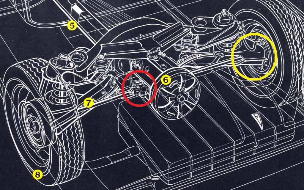 Toujours pour des raisons de budget, les suspensions proviennent (essentiellement) de la Corvair. On retrouve ainsi un essieu indépendant à l’avant avec des ressorts hélicoïdaux. Et comme mentionné précédemment, c’est un essieu oscillant qui est installé à l’arrière (swing axle). Dans un tel essieu, le combiné boîte/différentiel est monté sur le châssis et chaque demi-arbre de transmission utilise un cardan en sortie de différentiel (cercle rouge sur la photo ci-dessous). Par contre, la liaison du côté de la roue est rigide (cercle jaune sur la photo ci-dessous).