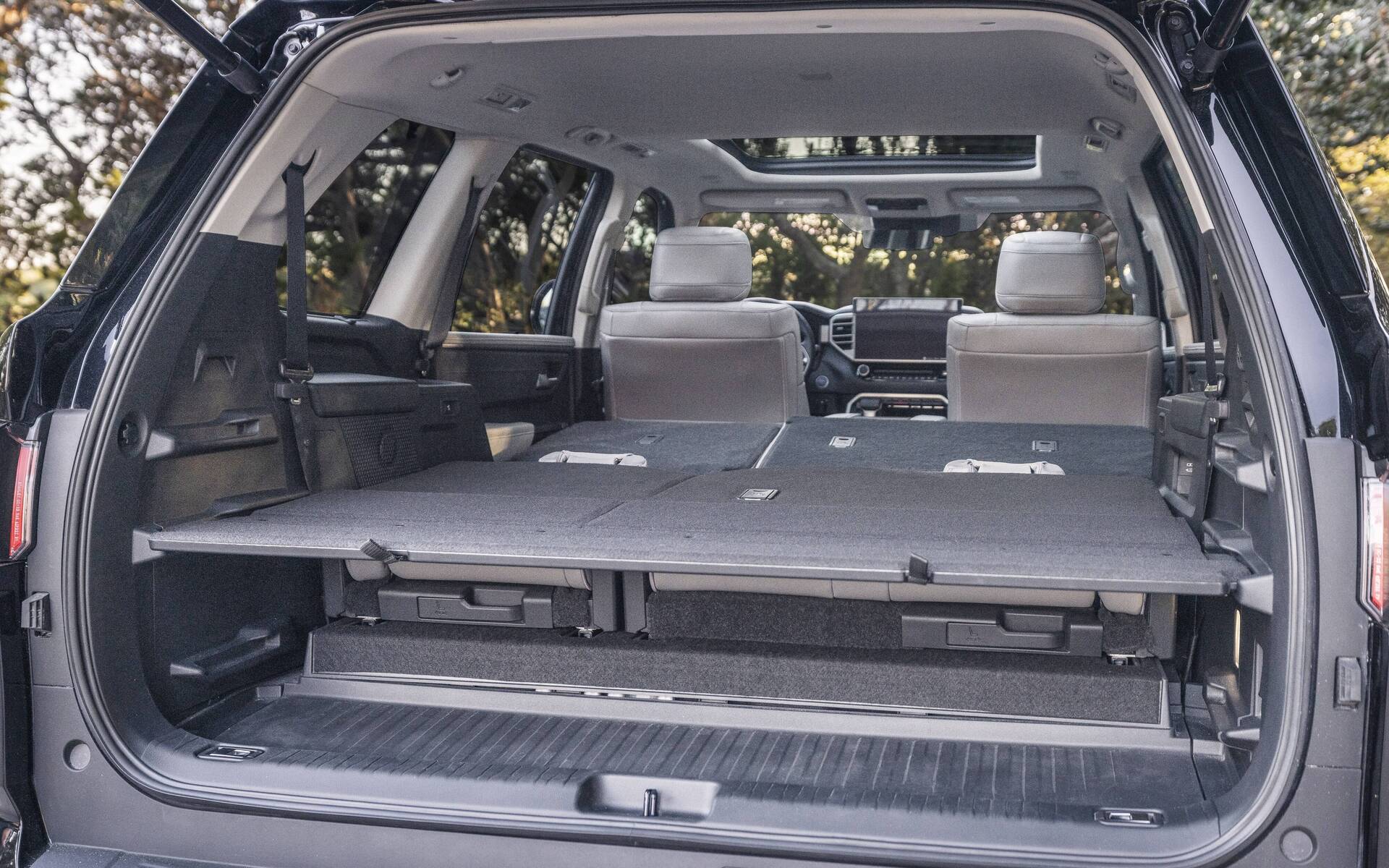 Avouons-le, le Sequoia est authentiquement américain. Encore plus que l’Armada, destiné de son côté à des marchés internationaux. En fait, le Sequoia fait appel à l’essentiel des éléments techniques de la camionnette Tundra, incluant une puissante motorisation hybride qui, au total, permet d’obtenir 583 lb-pi de couple. C’est un net avantage lorsqu’il est question de charge et de remorquage, Toyota se situant d’ailleurs parmi les plus costauds du segment à ce chapitre. Qui plus est, la mécanique du Sequoia fait preuve d’une puissance supérieure à la moyenne pour une consommation réelle avoisinant les 12 L/100 km.