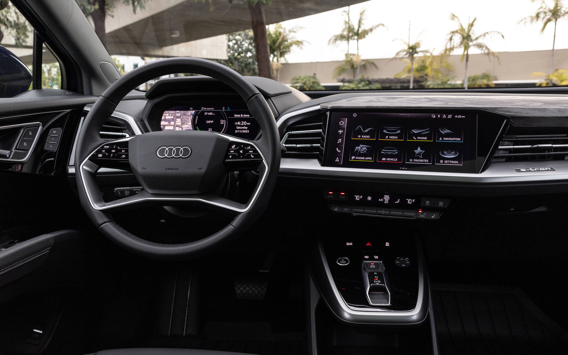 À l’intérieur, la planche de bord ne reprend aucun élément du modèle Volkswagen ID.4 avec lequel il partage une bonne partie de ses organes mécaniques. En effet, les concepteurs d’Audi ont voulu s’éloigner le plus possible des origines roturières de l’ID.4. Pour mettre le Q4 e-tron en marche, il faut actionner un rectangle peu intuitif intégré à la petite console centrale où d’autres commandes (volume de la chaîne audio, mode de conduite, bouton-démarreur, aide au stationnement, etc.) sont déjà logées. En revanche, Audi a eu la bonne idée d'utiliser une série de boutons traditionnels pour la température et la ventilation sous l’écran central tactile.