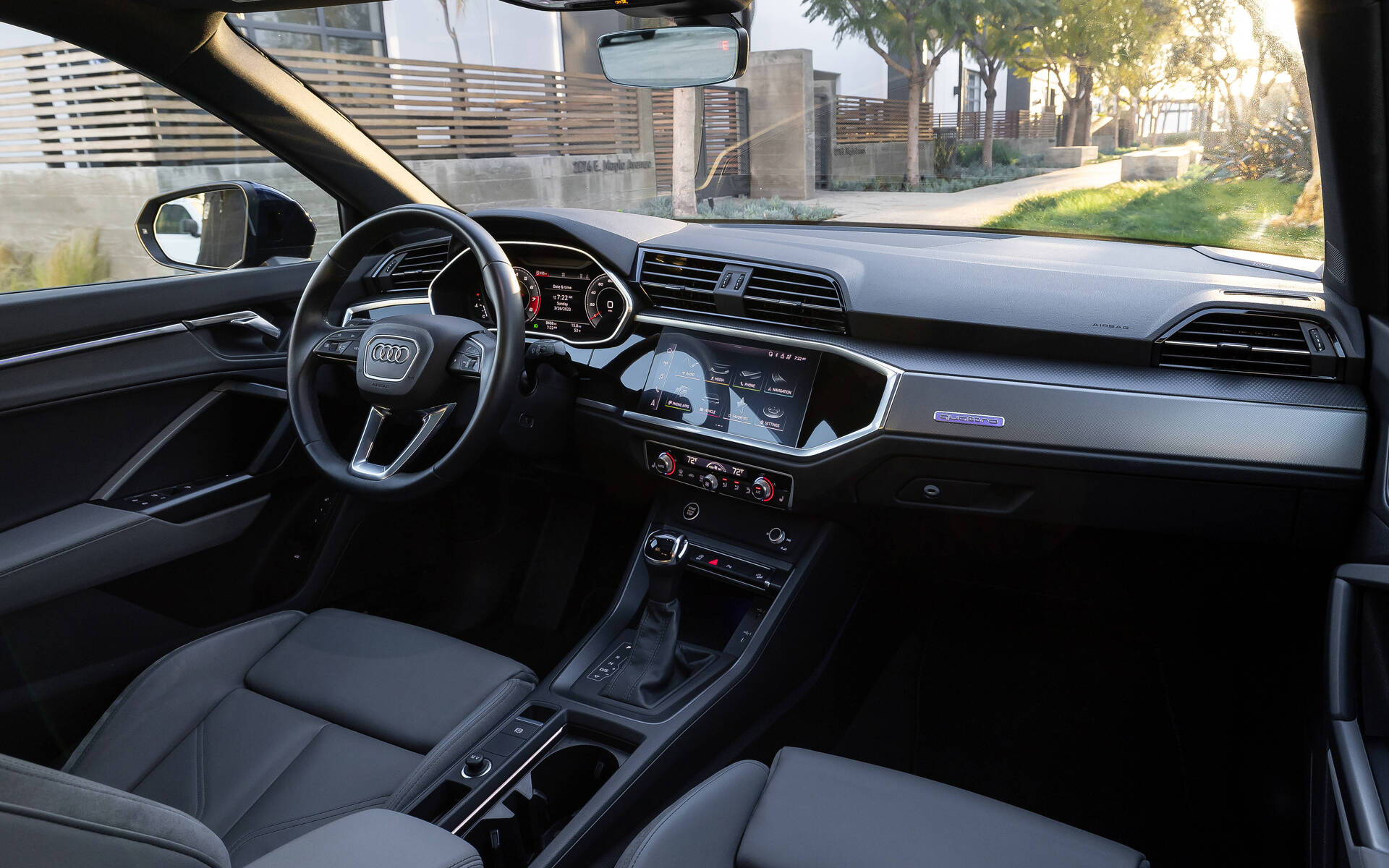 Dans l'habitacle, les habitués de la marque s’y retrouveront assez facilement. La planche de bord n’apporte rien de nouveau au chapitre du design intérieur, mais un simple balayage visuel de celle-ci permet de constater que l’ergonomie a été soignée par Audi. L’écran central tactile est inséré plus bas que le combiné d’instrumentation face au conducteur. Un agencement devenu très rare de nos jours. À ce sujet, le système multimédia fait preuve d'une très bonne réactivité aux commandes de l’utilisateur, ce qui fait vite oublier la position plus basse de ce dernier. Le volant est quant à lui l’un des plus agréables à tenir en main de l’industrie et la position de conduite est très facile à trouver. La visibilité périphérique est aussi l’un des points forts de l’Audi Q3, les designers ayant veillé à ne pas trop « fermer » l’habitacle avec une fenestration réduite ou un angle de lunette arrière impossible. Mentionnons également l’excellente qualité des matériaux, fidèles aux standards que s’impose le constructeur depuis plusieurs années.