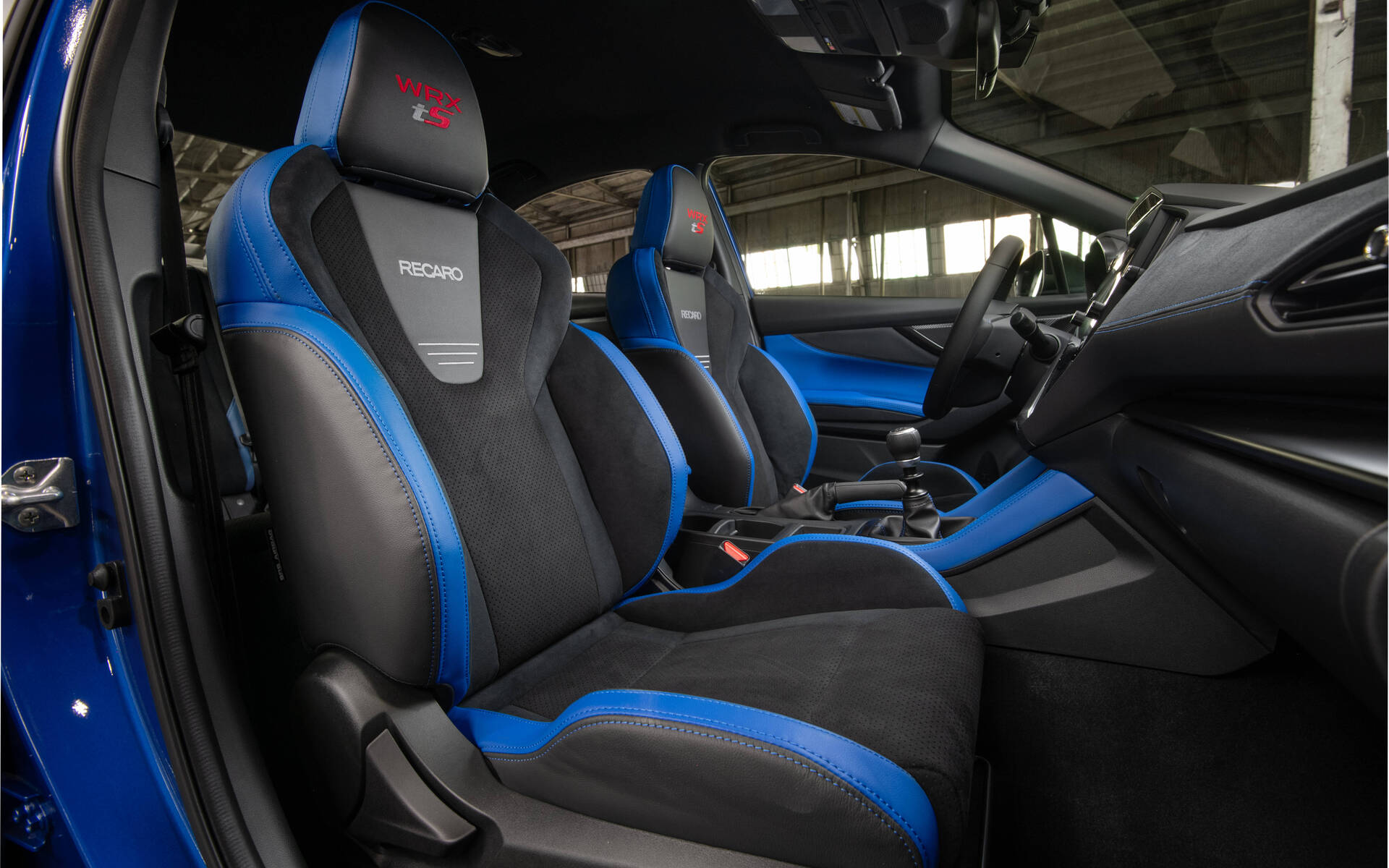 À l’intérieur, le conducteur profite d’un écran de 12,3 pouces à la place du combiné d’instrumentation à aiguilles. L’habitacle reçoit des insertions bleues sur les contre-portes, la console centrale, ainsi que sur les sièges sport signés Recaro. Nous n’avons pas encore eu la possibilité d’étrenner cette nouvelle WRX tS, mais elle devrait logiquement se comporter comme la RS.