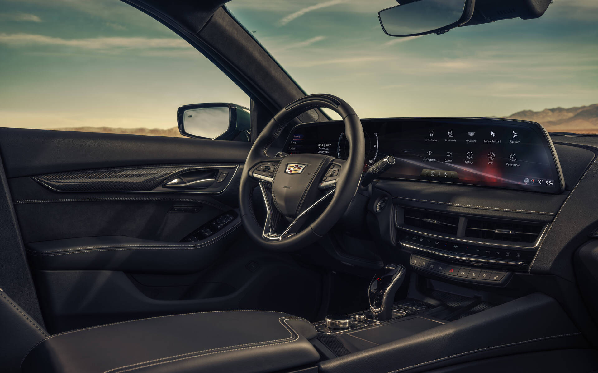 Cadillac a aussi revu l’habitacle, le changement le plus notable étant un nouvel écran haute définition de 33 pouces. Ce moniteur, que l’on retrouve aussi dans le Lyriq et le XT4, affiche les informations nécessaires à la conduite face au conducteur. Côté droit, il fait office de système multimédia. Le constructeur a également revu l’interface avec Google, afin d’améliorer la connectivité et de faciliter la vie des utilisateurs. Les modèles sportifs CT5-V et Blackwing profitent évidemment du même système, mais ajoutent un enregistreur de données modernisé. Enfin, les amateurs de technologie seront ravis d’apprendre qu’un modem 5G est disponible.
