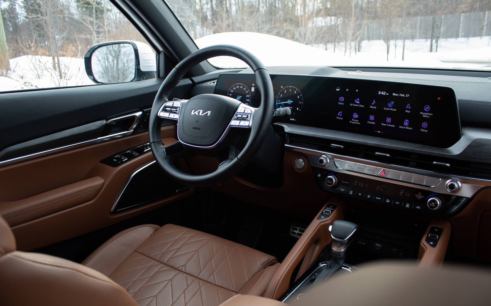 À l’avant, les commandes sont disposées de manière logique. La présence de boutons physiques est aussi appréciable. Cela dit, les utilisateurs peuvent également manipuler le tout à même le système multimédia de 12,3 pouces. C’est, certes, une redondance dans les fonctions, mais il est mieux d’avoir cette possibilité que rien du tout. En revanche, l’interface de l’infodivertissement (bien que très jolie) se montre plutôt chargée, surtout lorsqu’il est temps de naviguer dans les sous-menus. De plus, certains gadgets semblent sympathiques (comme le Voice Memo), mais s’avèrent superflus. L’instrumentation de 12,3 pouces (4,2 dans le Telluride EX) est, quant à elle, élégante et facile à lire.