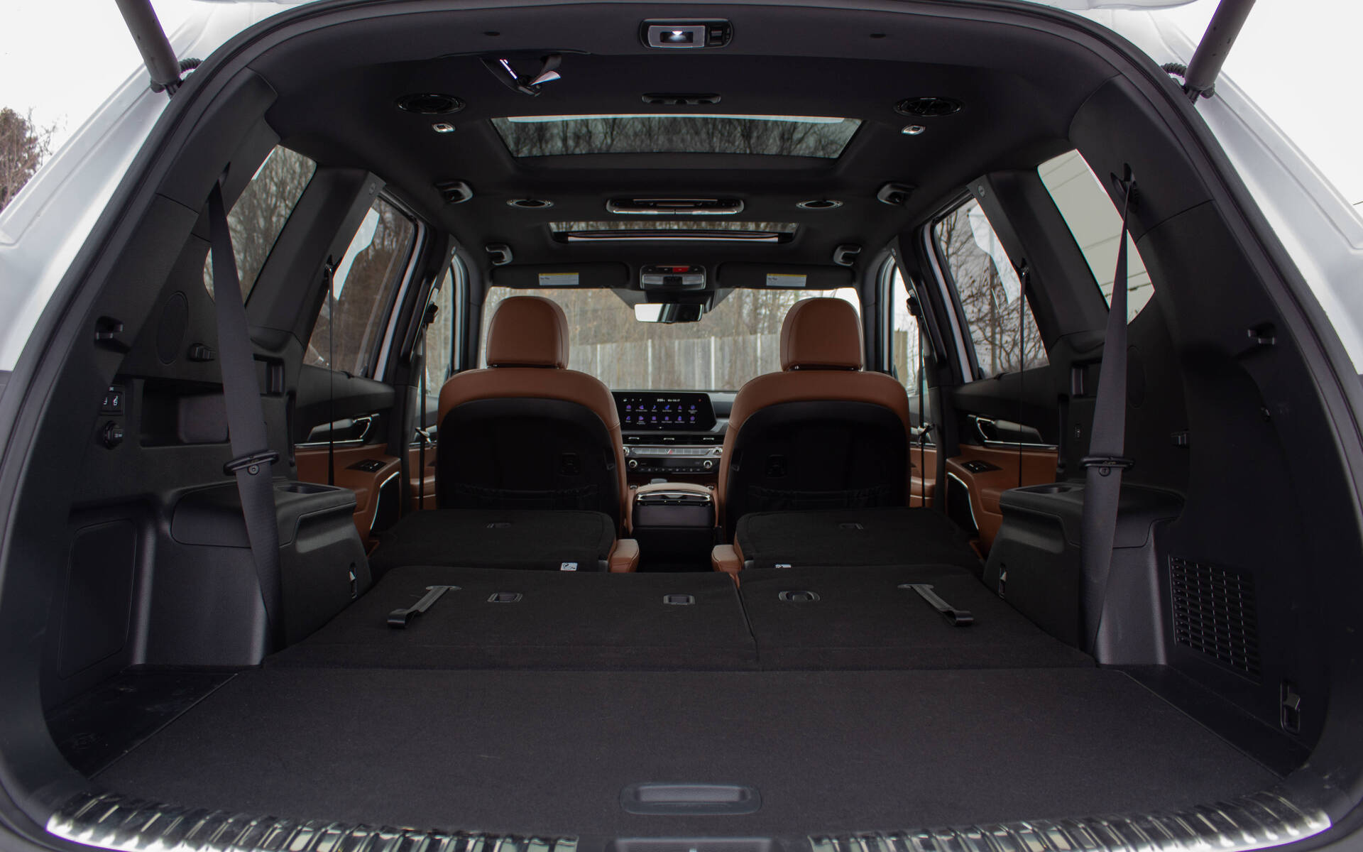 Vu la taille du véhicule, les occupants jouiront d’un espace généreux… à quelques détails près. La banquette de la troisième rangée peut accommoder des adultes, mais seulement pour de courtes ou moyennes distances. Pour y accéder, l’ouverture de la portière et l’angle du toit permettent de rentrer sans tracas. À l’avant, les sièges sont larges et très confortables. Par contre, la console centrale intègre une structure de chaque côté qui réduit inutilement l’espace.