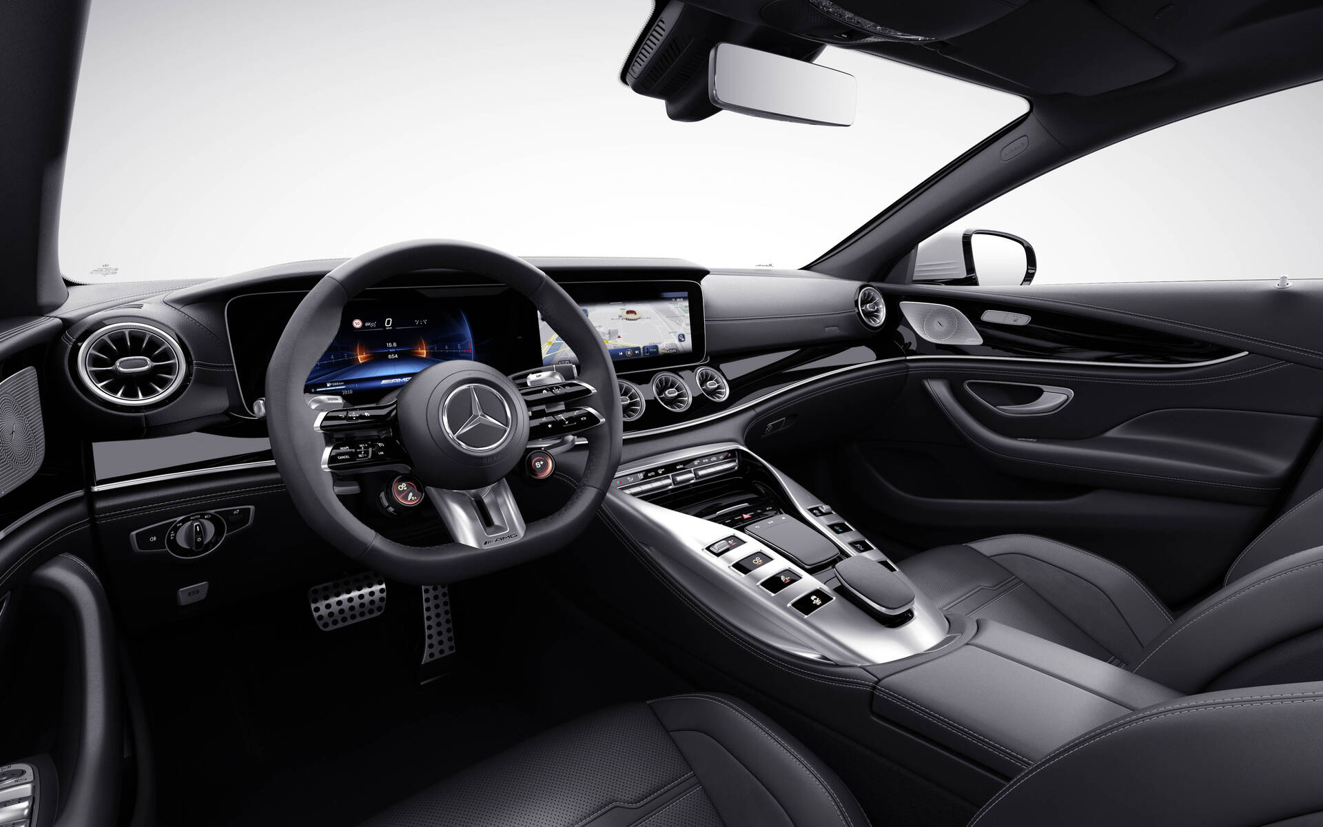 Peu importe le modèle, l’habitacle de l’AMG GT demeure le même et fait preuve d’une excellente qualité de finition. La console centrale est très large et comporte de nombreux boutons physiques permettant d’accéder rapidement à plusieurs fonctionnalités. Le système multimédia MBUX adopte un affichage spécifique à AMG, tout comme l’écran d’instrumentation alors que le volant comporte deux contrôleurs rotatifs, dont un sert à la sélection du mode de conduite.