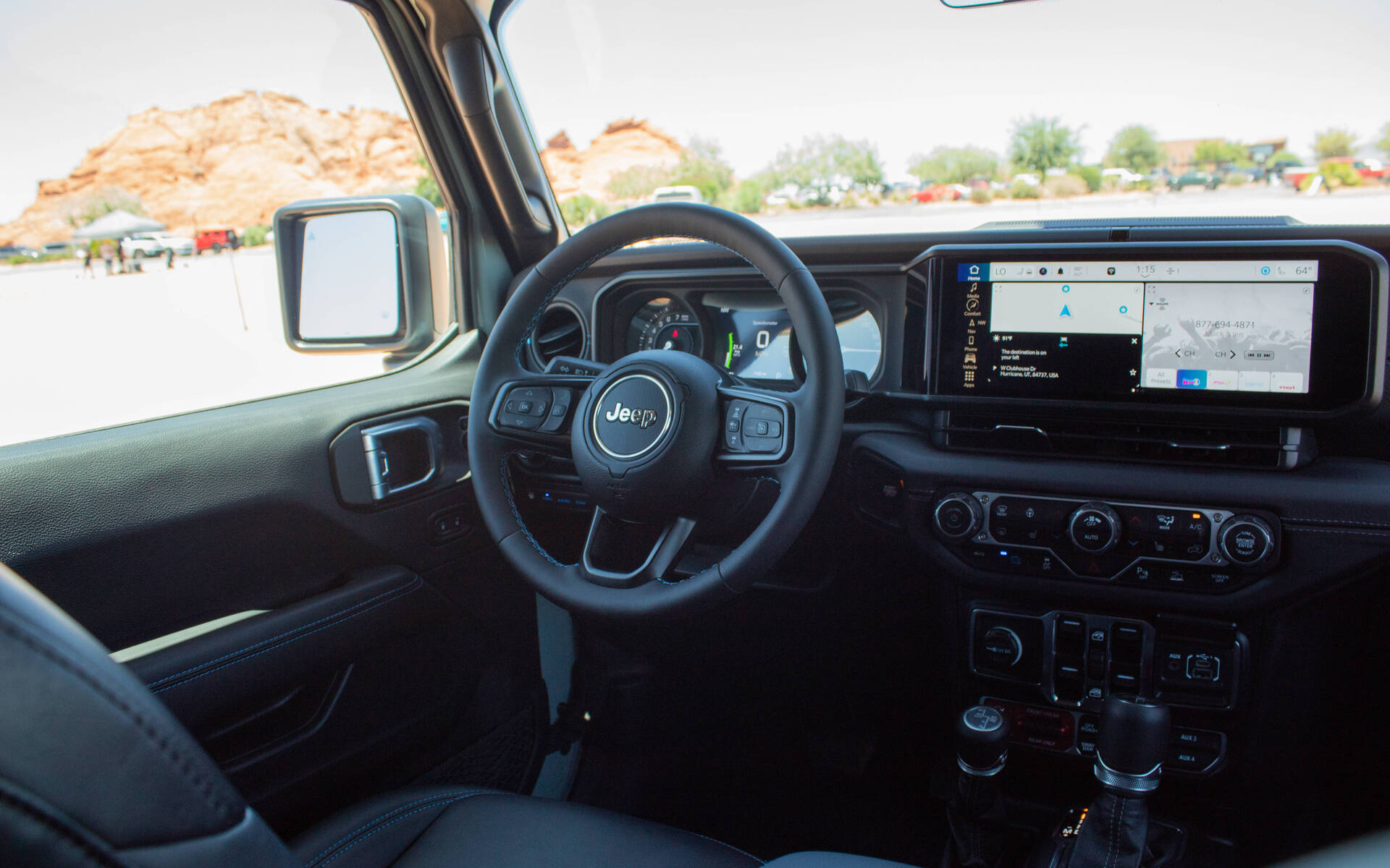 Si le Wrangler excelle en dehors des sentiers battus, c'est une autre histoire sur le tarmac. La configuration de la suspension et de la direction fait en sorte qu’il faut sans cesse corriger la trajectoire. Cela est amplifié par sa sensibilité aux vents latéraux et par ses amortisseurs bondissants, nuisant à la stabilité lorsqu’il est temps de tirer de lourdes charges. En ce qui concerne le confort, la position de conduite du Wrangler est particulière. Le pare-brise vertical et près de la planche de bord fait certes partie de son charme, mais vous contraint à vous asseoir très droit. L’absence de repose-pied demeure aussi une source d’irritation. Concernant les commodités, le système d’infodivertissement est doté d’un écran de 12,3 pouces qui incorpore le système Uconnect 5. L’interface ergonomique inclut des gadgets pour aider le pilote à manœuvrer en hors route.