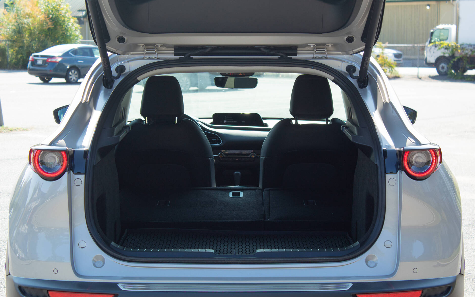 Le CX-30 possède les vertus habituelles de Mazda, mais hérite aussi de ses défauts. Si vous recherchez un véhicule familial, nous vous conseillons de changer de page. Avec un coffre de 1 280 litres, dossiers arrière rabattus, ce VUS compte parmi les moins spacieux de l’industrie. Pour rabattre la banquette à plat, il faut retirer les appuie-têtes ou avancer les sièges avant, un petit problème pour les grands conducteurs! Enfin, la visibilité médiocre génère d’importants angles morts.