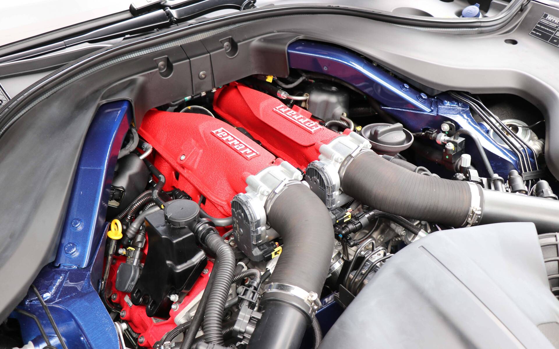 Parlons du cœur de l’engin : le V8 F154 BH. Le F154 est actuellement l’un des meilleurs moteurs du monde. Couplé à une boîte à double embrayage en bain d’huile introduite dans la SF90 Stradale (ici avec une marche arrière et un rapport final plus long) placée à l’arrière pour une répartition du poids optimisée, ce bloc est doté d’un logiciel qui ajuste le couple en fonction du rapport engagé. Le couple maximal n’est disponible que sur les 7e et 8e rapports. Avec un vilebrequin à manetons plats (flat plane) et une lubrification par carter sec, il est respectivement capable de prendre des tours (7 500 tr/min) et des G latéraux.