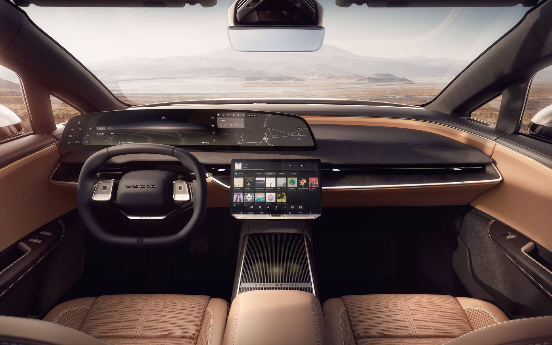 L’avantage de partir d’une nouvelle plate-forme (en aluminium) est de pouvoir optimiser l’espace. Lucid annonce un volume utile de 3 170 litres et un coffre avant de 227 litres. L’habitacle peut offrir jusqu’à 7 places et, bonne nouvelle, les sièges de troisième rangée semblent pouvoir accueillir des adultes confortablement. À la deuxième rangée, plutôt que d’installer des écrans pas très utiles, la marque a choisi d’intégrer de solides tables avec des supports pour vos propres écrans. Les occupants de la rangée avant ne seront pas dépaysés s’ils connaissent déjà la berline Air. L’écran OLED incurvé de 34 pouces en définition 6K a été remonté et le volant est devenu rectangulaire pour améliorer la lecture des instruments. Le conducteur peut se construire un cocon avec le mode Sanctuary en jouant avec l’éclairage, l’affichage d’images, le siège massant ou l’utilisation d’applications de pleine conscience… ou bien occuper les enfants pendant la recharge avec la fonction karaoké! Autre fonction intéressante, la digital detox qui réduit l’affichage sur les écrans au strict essentiel (et qui rappelle dans l’esprit le night panel de Saab). À noter enfin que Lucid n’a pas encore succombé à la mode de supprimer les boutons pour les fonctions courantes… et c’est tant mieux!