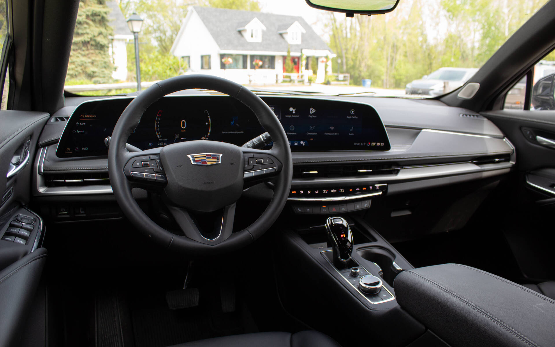 Le système d’infodivertissement bénéficie de quelques-unes des applications du géant Google, mises en action par un simple « Hey Google ». Que ce soit pour retrouver son chemin ou pour ajuster la température dans l’habitacle, le large écran est facile à utiliser au quotidien et, si ce n’est pas suffisant, les concepteurs ont conservé quelques commandes traditionnelles sur la console centrale et sous le panneau numérique. Bien entendu, les fonctions Apple CarPlay et Android Auto sont toujours compatibles, tandis qu’un pavé de recharge pour appareil intelligent est judicieusement dissimulé. En fait, il est si bien caché qu’il n’est pas rare d’oublier le cellulaire en sortant du véhicule. Heureusement, le Cadillac émet une alarme pour vous rappeler de le prendre.