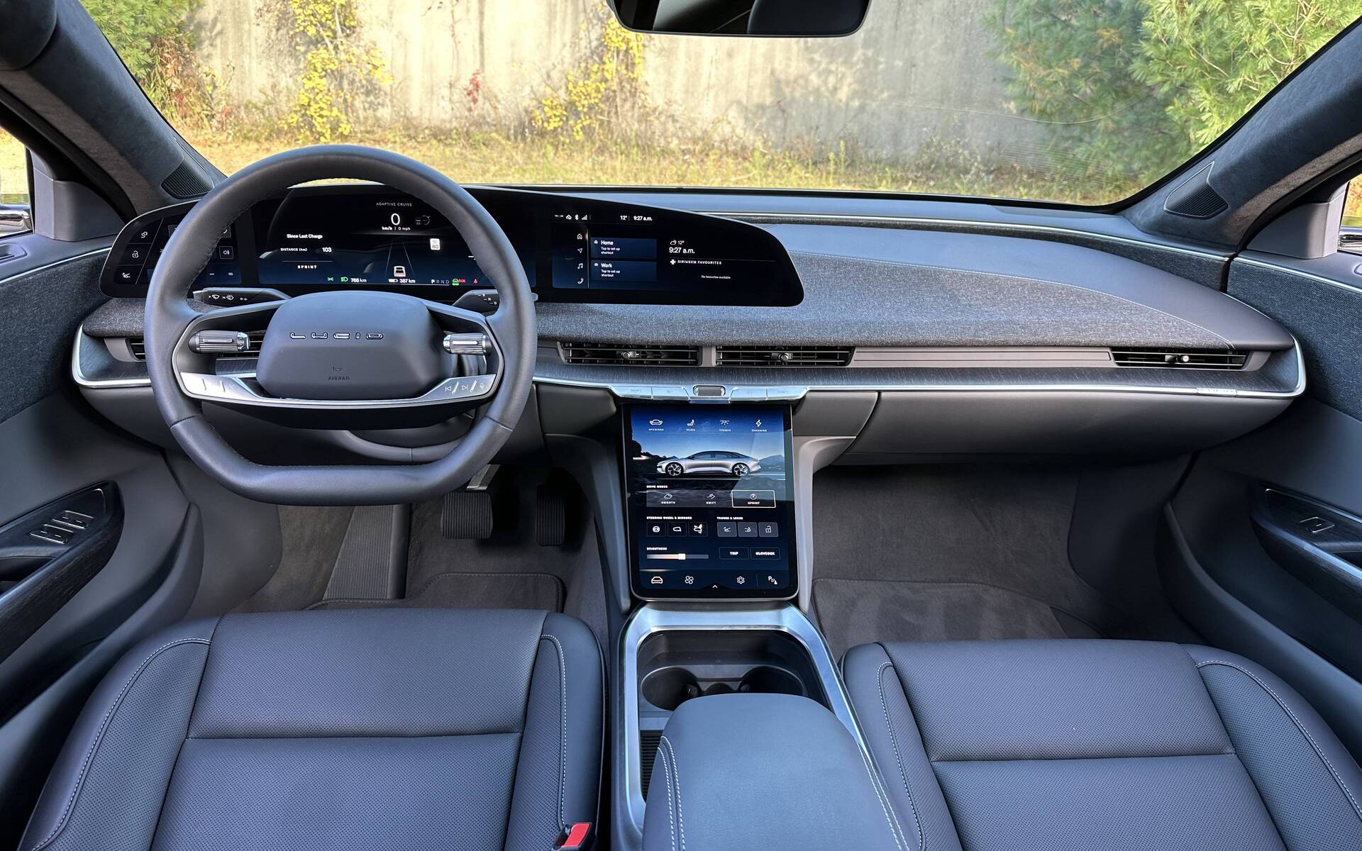 L’habitacle des Lucid Air n’affiche ni l’opulence, ni le clinquant des automobiles européennes les plus en vue. Tapissé de matériaux de qualité, bien agencés, il est cependant plus attrayant et nettement mieux fini que celui de la Model S. Le tableau de bord rigoureusement classique se rachète en échappant à la mode fatiguée des écrans rectangulaires. L’écran supérieur est clair et complet tandis que l’écran central, où s’effectue la majorité des réglages, se rétracte pour découvrir un grand fourre-tout. On apprécie l'efficacité de commandes physiques pour les systèmes essentiels.