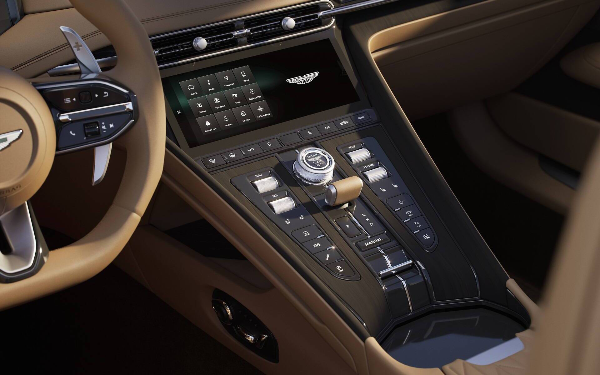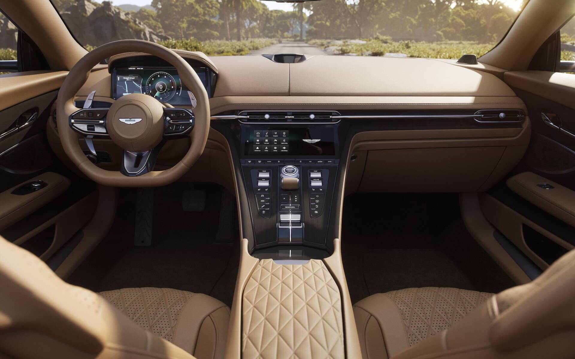 Le cœur de la DB12, rappelons-le, provient de chez Mercedes-AMG mais a été réglé par les ingénieurs d’Aston Martin. C’est un V8 biturbo de 4 litres qui génère 671 chevaux à 6 000 tr/min et un couple de 590 lb-pi entre 2 750 et 6 000 tr/min, n’entraînant aucun point mort à l’accélération. Le poids de la voiture n’en fait pas la plus explosive de son espèce, mais on parle tout de même d’un sprint de 0 à 100 km/h en 3,6 secondes – un dixième de plus pour le cabriolet.