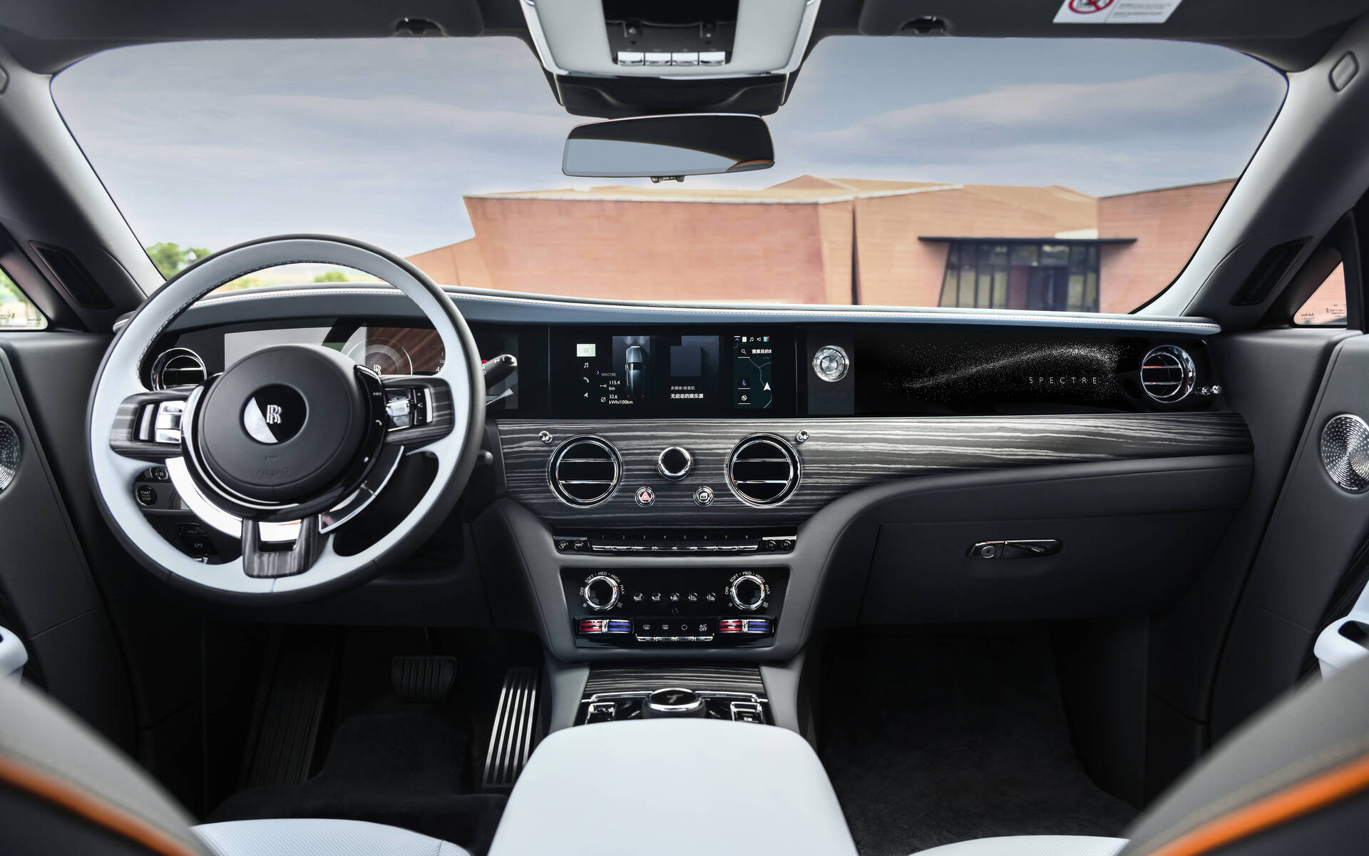 Comme souvent chez Rolls-Royce, on ne peut pas dire que le design atteigne des sommets d’originalité. Quoi qu’il en soit, ce grand coupé électrique en impose lorsqu’on le détaille de près. À l’ouverture de la porte antagoniste, le conducteur découvre un habitacle superbement fabriqué, digne de la réputation de la marque. Après s’être installé sur un siège moelleux, le silence presque assourdissant surprend une fois en route. Filtrant parfaitement les bruits environnants, la Spectre enveloppe ses passagers dans un cocon protecteur, mettant en avant un confort absolument royal. Que ce soit les sièges, la suspension ou l’insonorisation, tout a été travaillé pour offrir l’expérience de conduite la plus silencieuse possible. Même la très furtive Ghost doit s’avouer vaincue face à la quiétude ressentie à bord de la Spectre.
