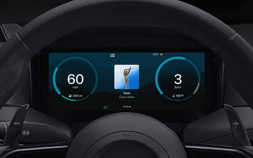 Par exemple, CarPlay Ultra permet de varier l’affichage des cadrans (indicateur de vitesse, compte-tours, etc.) de nouvelles façons. Le conducteur peut choisir d’avoir les informations de son iPhone, comme les cartes et les médias, ainsi que les informations provenant de la voiture, comme les systèmes avancés d'aide à la conduite et la pression des pneus, directement dans le tableau de bord.