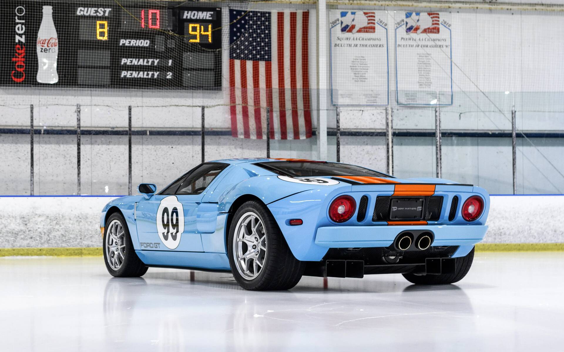La GT, rappelons-le, a été ressuscitée une première fois en 2005-2006. Celle-ci, un des 343 exemplaires Heritage Edition qui ont été produits à l’époque, arbore l’emblématique livrée Gulf bleu pâle et orange en hommage aux GT40 qui ont couru et remporté les 24 Heures du Mans en 1968 et 1969. Le numéro de course sur les flancs, naturellement, est le légendaire 99 porté par Gretzky durant toute sa carrière professionnelle.