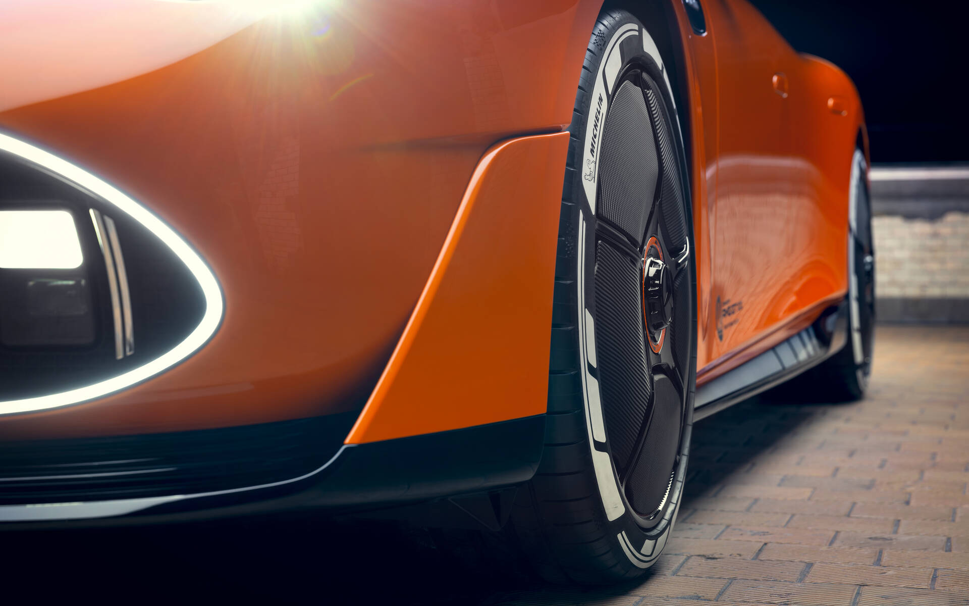 La vue de profil, beaucoup plus attrayante, se caractérise par des surfaces fluides et épurées ainsi que des roues surdimensionnées de 21 pouces. Celles-ci ont des sections qui s’ouvrent et se ferment afin d’optimiser tantôt le refroidissement des freins, tantôt l’aérodynamisme. Entre les roues avant et arrière, les jupes latérales intègrent des segments de peinture luminescente qui dégagent de la lumière en réaction à un courant alternatif, explique le constructeur.
