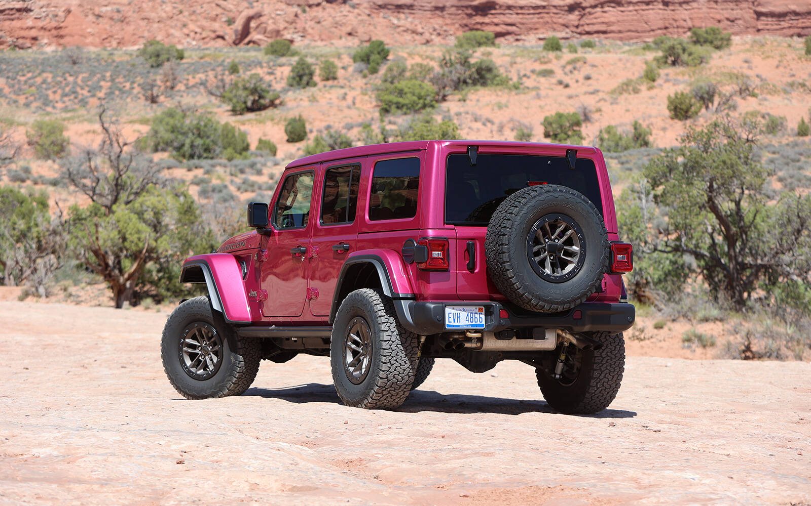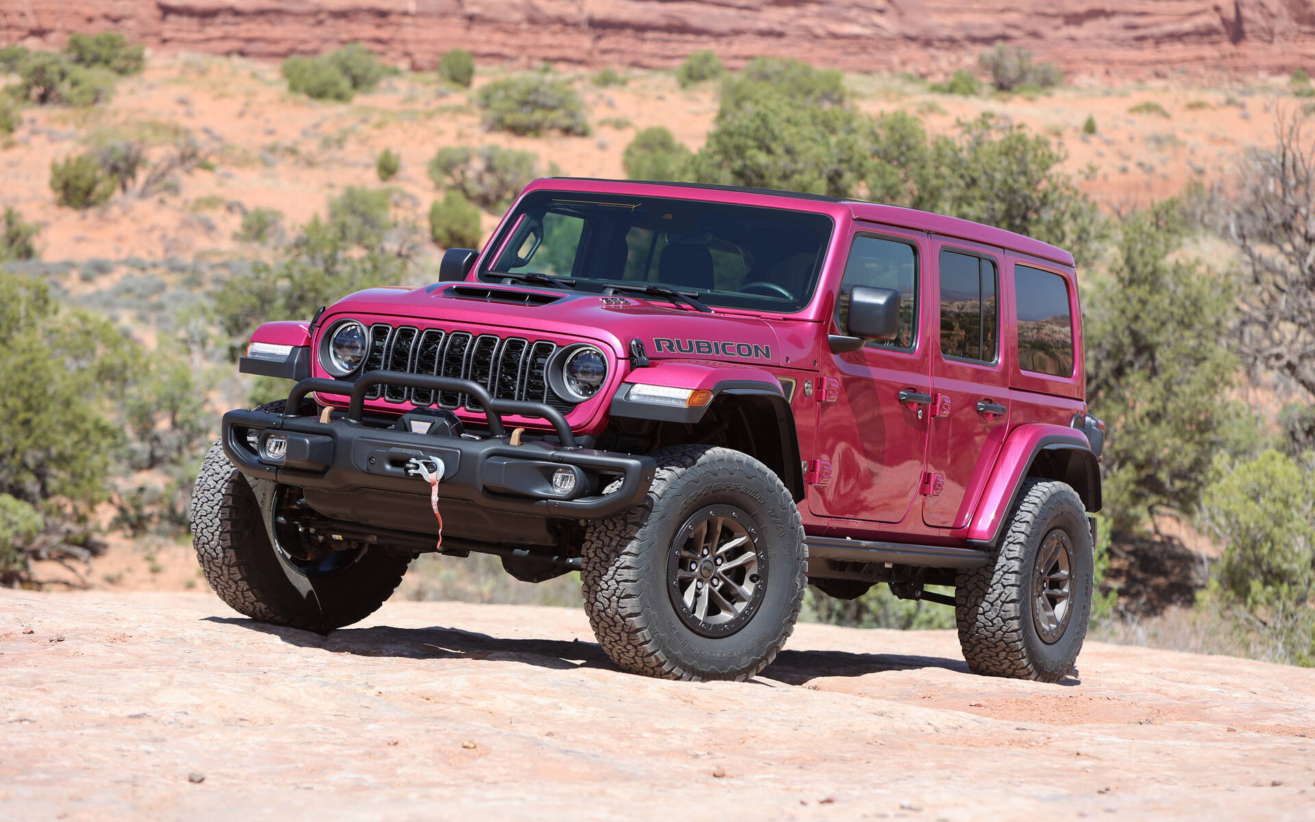 C’est lors d’un événement Jeep dans le désert de Moab, en Utah, que nous avons eu la chance de mettre à l’essai diverses versions de la gamme Wrangler 2025 : un Rubicon X à deux portières et à moteur turbocompressé de 2 litres, un Willys 41’ 4xe hybride rechargeable et un Sahara avec un V6 Pentastar. Toutefois, ce Rubicon 392 couleur rose Tuscadero volait la vedette aux autres : couleur voyante, sonorité rugissante et l’option du toit Sky One-Touch permettant de rouler à ciel ouvert à la seule pression d’un bouton. Une combinaison ultra rare que même les organisateurs de l’événement, habitués au Wrangler sur une base quotidienne, avaient en admiration.