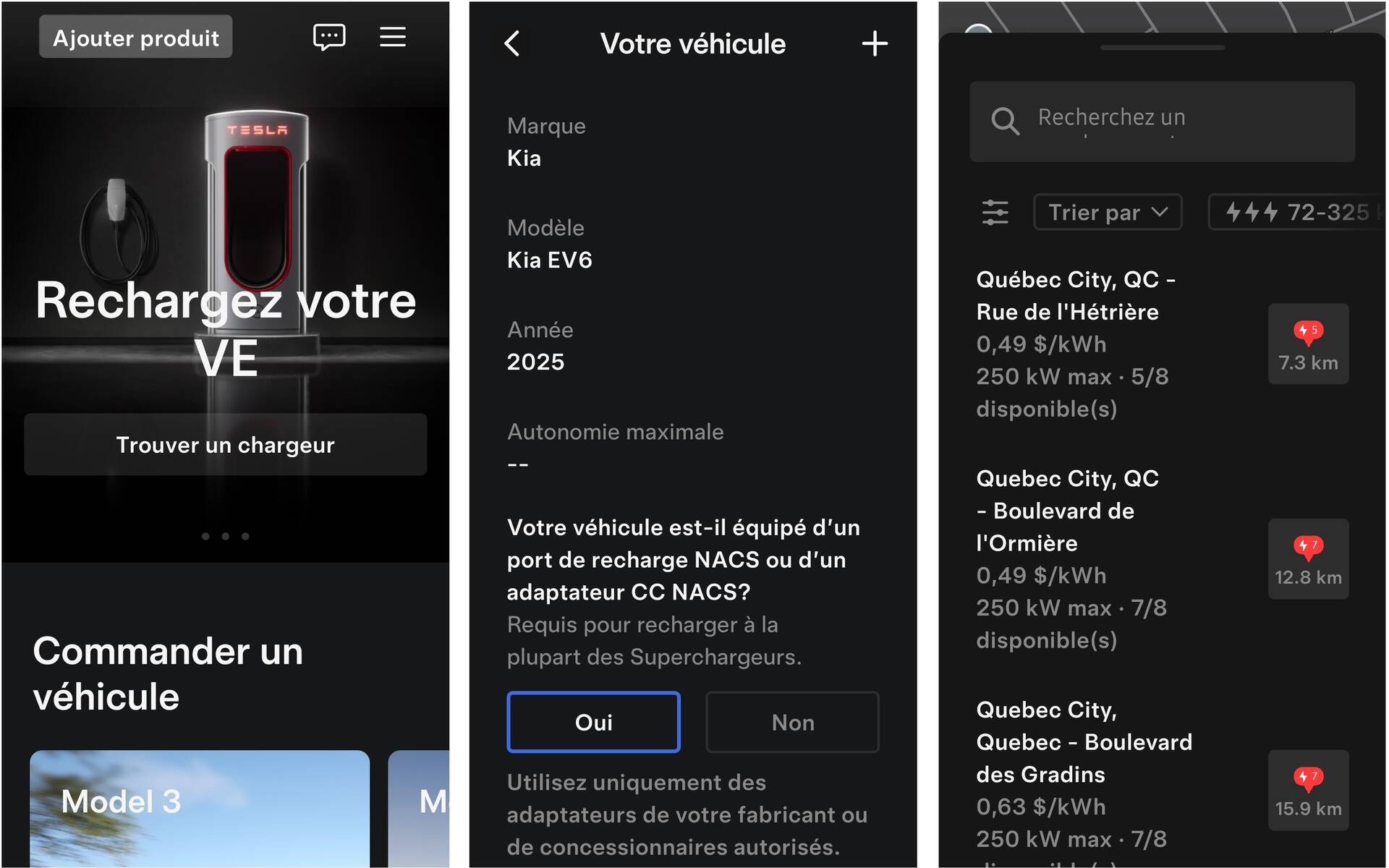 L’application est bien conçue et simple à utiliser. Une fois installée, on commence par créer notre compte personnel et identifier notre véhicule via le menu en haut, à droite, en prenant le soin de confirmer qu’il est équipé d’un port de recharge NACS (ou d’un adaptateur CCS-NACS, le cas échéant). Ensuite, de retour à l’écran d’accueil, on clique sur le bouton pour trouver un Superchargeur en précisant la ville, ce qui permettra d’identifier l’emplacement des bornes compatibles à proximité. Les résultats nous renseignent aussi sur la tarification au kWh, la puissance maximale et le nombre de bornes disponibles.