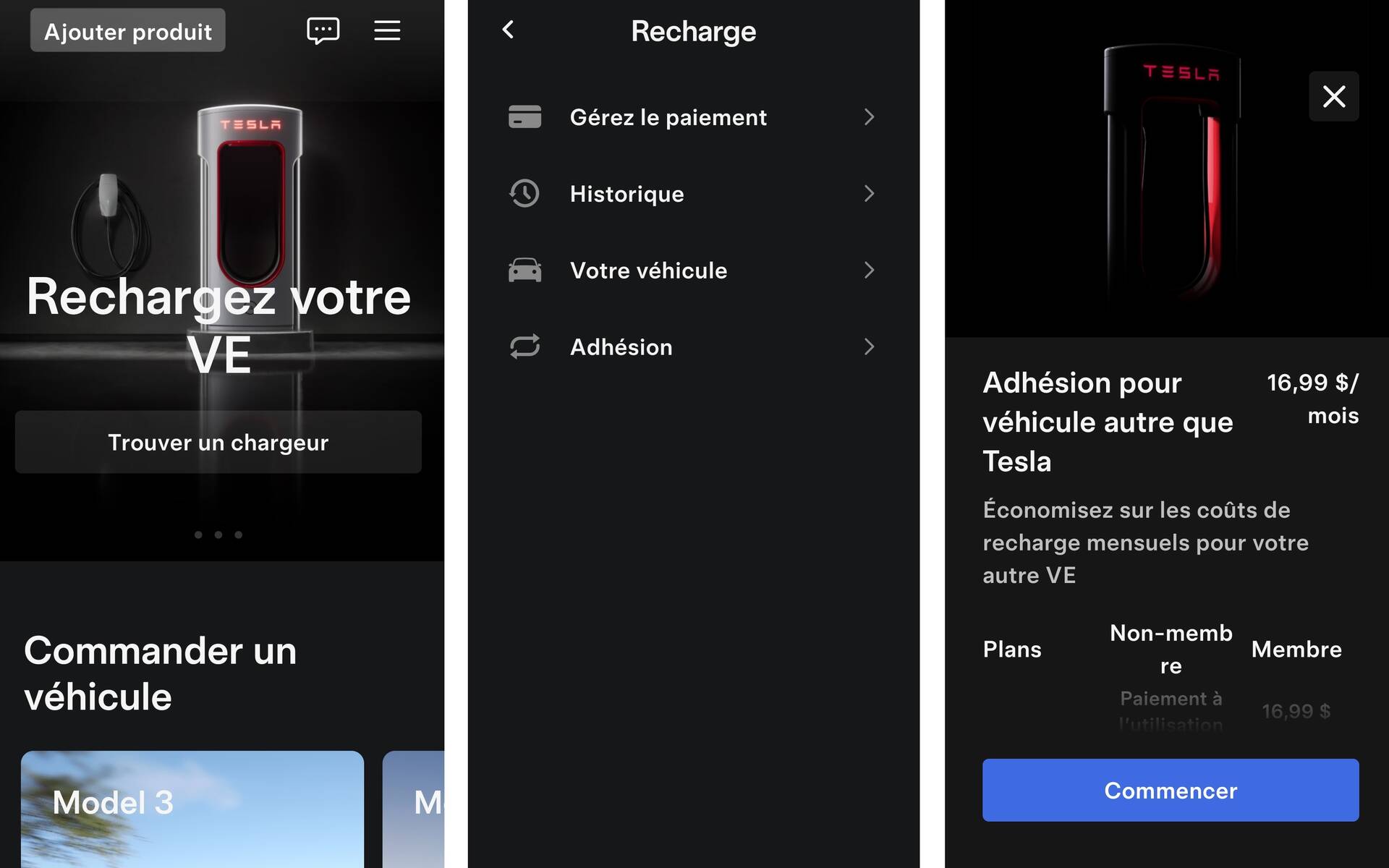 Le menu comprend également un onglet « Gérez le paiement » où l’on peut lier une carte de crédit valide afin de pouvoir payer les séances de recharge aux Superchargeurs. Un autre onglet appelé « Adhésion » propose d’économiser sur les coûts de recharge mensuels en adhérant à un forfait. Celui-ci est fixé à 16,99 $/mois actuellement mais, comme il s’agit de Tesla, le prix peut changer à tout moment. C’est assez facile de rentabiliser la dépense même en n’effectuant qu’un petit nombre de recharges par mois.