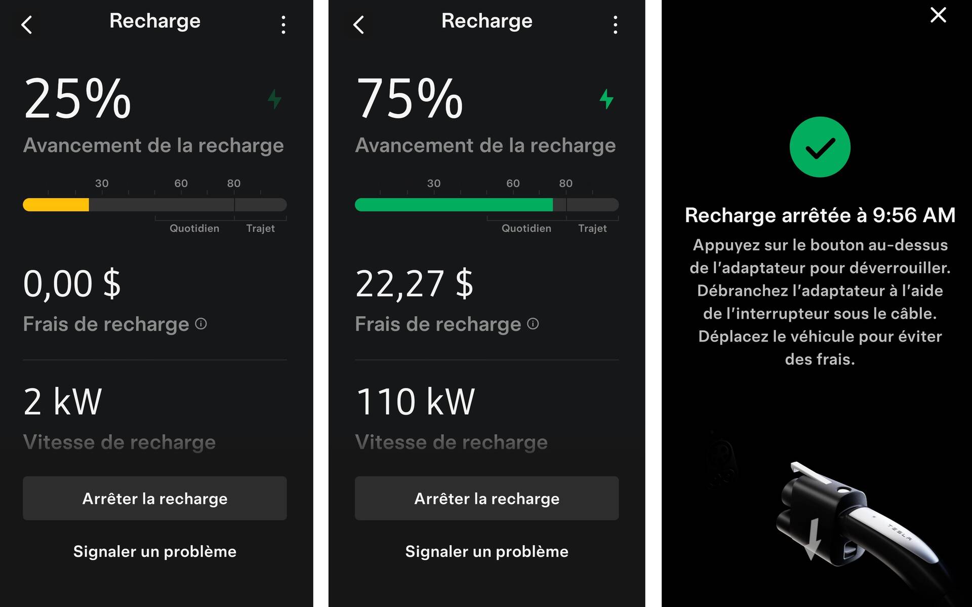 Donc, une fois arrivé à la station de recharge, il suffit de choisir une borne libre, de l’identifier par son numéro dans l’application et de brancher le câble pour lancer la recharge. L’application affiche clairement le pourcentage de la batterie, la puissance de recharge extraite du Superchargeur en kilowatts et les frais de recharge en temps réel. À n’importe quel moment, il est possible d’arrêter la séance ou de signaler un problème à Tesla. Lorsque la recharge est terminée, l’application nous invite à déverrouiller le câble (ou l’adaptateur) et à le débrancher, après quoi un résumé de la séance (durée, énergie livrée, frais, etc.) est affiché, puis enregistré dans l’onglet « Historique » du menu.