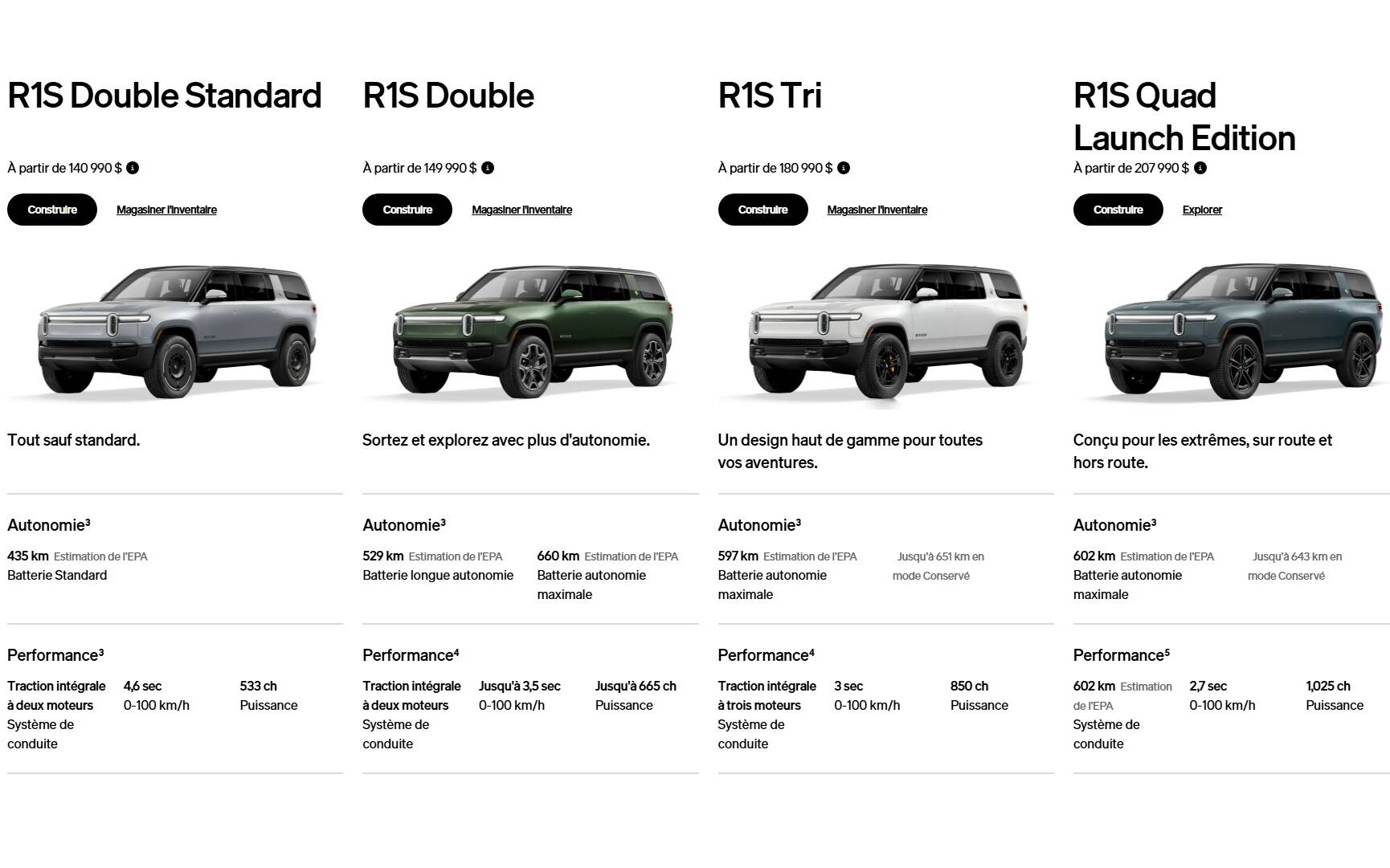 La camionnette R1T est passée de 102 900 $ à 129 990 $. De son côté, le VUS R1S a bondi de 111 900 $ à 140 990 $. Ces prix n’incluent ni les divers frais applicables, ni la taxe de luxe fédérale sur les produits de 100 000 $ et plus.