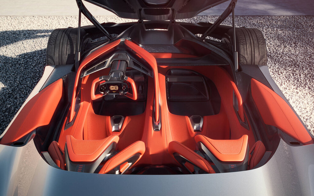 Dessiné en collaboration avec la division de performance GM Motorsports Aero Group, l’habitacle voit son inspiration tirée des avions de chasse. Pour rentrer dans le cockpit, la portion supérieure de la carrosserie s’élève à l’approche des occupants pour dévoiler un intérieur fini en rouge balistique. Le tout est agrémenté d’accents en cuir, en aluminium et en carbone forgé. Le pare-brise numérique affiche une panoplie d’informations liées à la conduite en temps réel et les commandes principales se trouvent sur le volant pour minimiser les distractions.