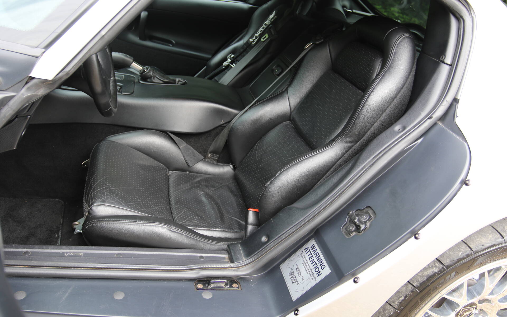 Le modèle que vous avez sous les yeux est une GTS de 1999, mais pas n’importe laquelle. En effet, il s’agit de la version ACR, la plus affûtée que l’on pouvait se procurer à l’époque. Il s’agit d’une édition spéciale destinée à commémorer la victoire de la Viper GTS-R dans la catégorie GT2 lors des 24 Heures du Mans 1998. Elle se distinguait, entre autres, par ses jantes BBS spécifiques de 18 pouces, des amortisseurs Koni recevant des ressorts spécifiques et des harnais à cinq points. L’énorme V10 de 8 litres, gagne aussi 10 chevaux et 10 lb-pi (460 chevaux, 500 lb-pi), ce qui ne change pas grand chose à ses performances.