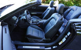 Piloter une Mustang GT cabriolet signifie également que son conducteur devient automatiquement le centre de l'attention, surtout lorsque le toit est replié entre le coffre et la banquette arrière. Dès le démarrage, assuré par un bouton-démarreur rouge, le V8 atmosphérique de 5 litres fait entendre son rugissement indémodable, une intensité qui peut aussi être contrôlée à l'aide d'une commande sur le côté gauche du volant. Grâce aux six modes de conduite, l’utilisateur peut personnaliser son expérience entre Normal, Sport, Glissant, Piste, Accélération et Personnalisé, ce dernier qui permet de choisir chaque paramètre comme bon lui semble.