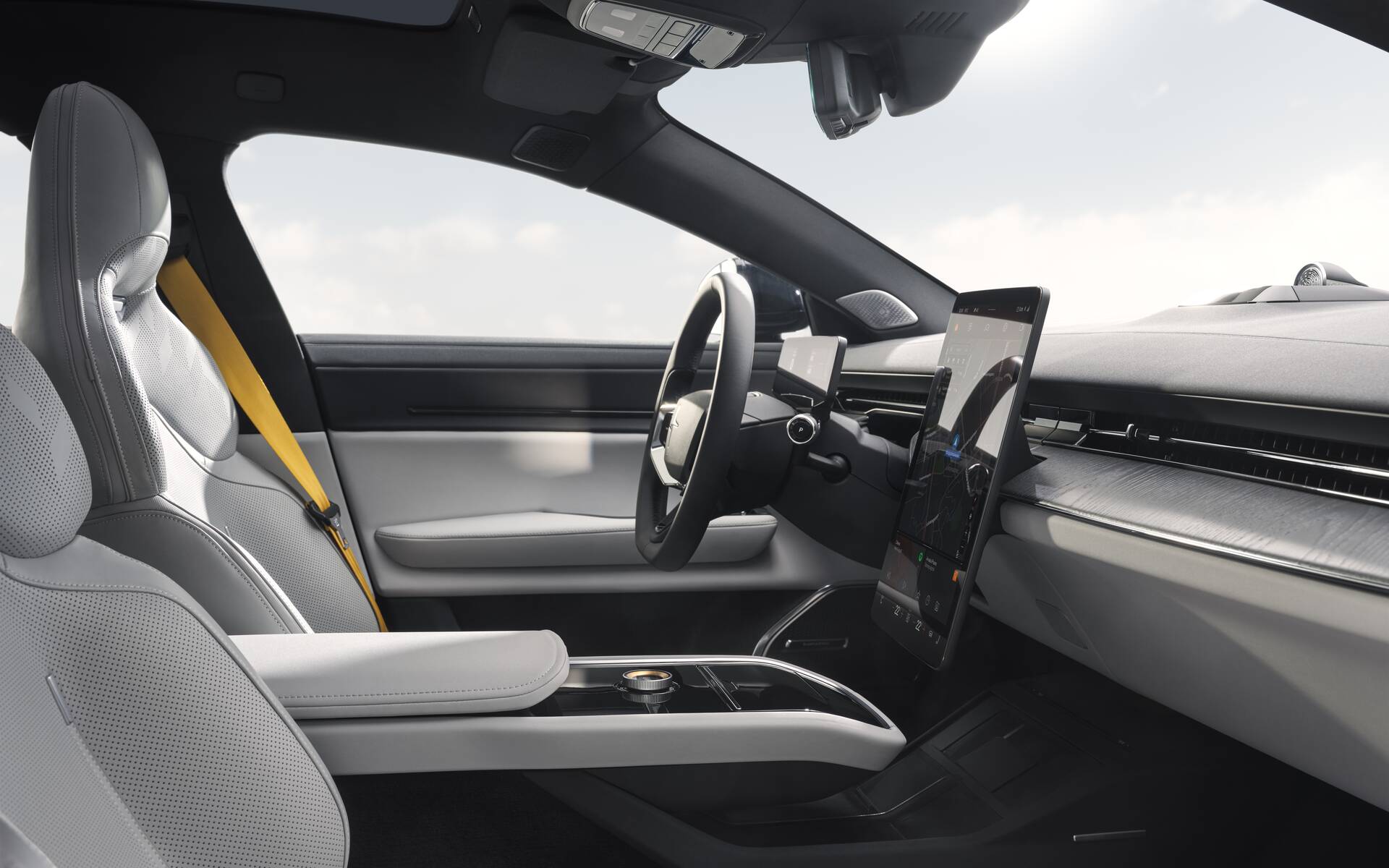 Le conducteur de la Polestar 5 trouve devant lui une instrumentation de 9 pouces montée directement sur la colonne de direction et donc toujours parfaitement visible, de même qu’un affichage tête haute de 9,5 pouces. À droite, l’écran central vertical de 14,5 pouces, naturellement propulsé par un système d’exploitation Android Automotive, surplombe une console centrale basse où l’on retrouve un contrôleur audio rotatif.
