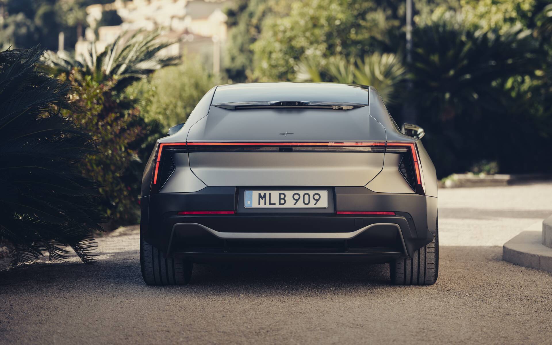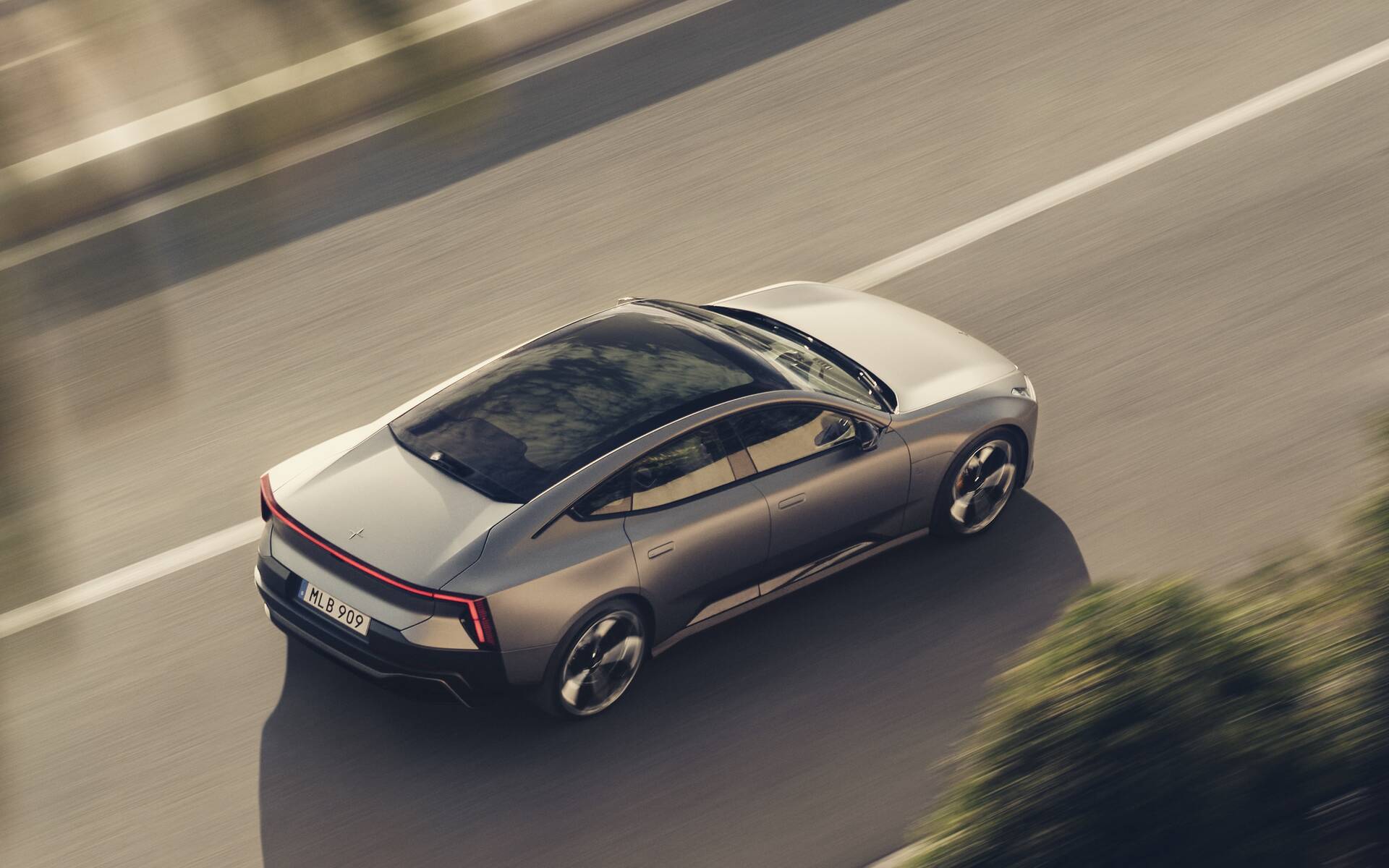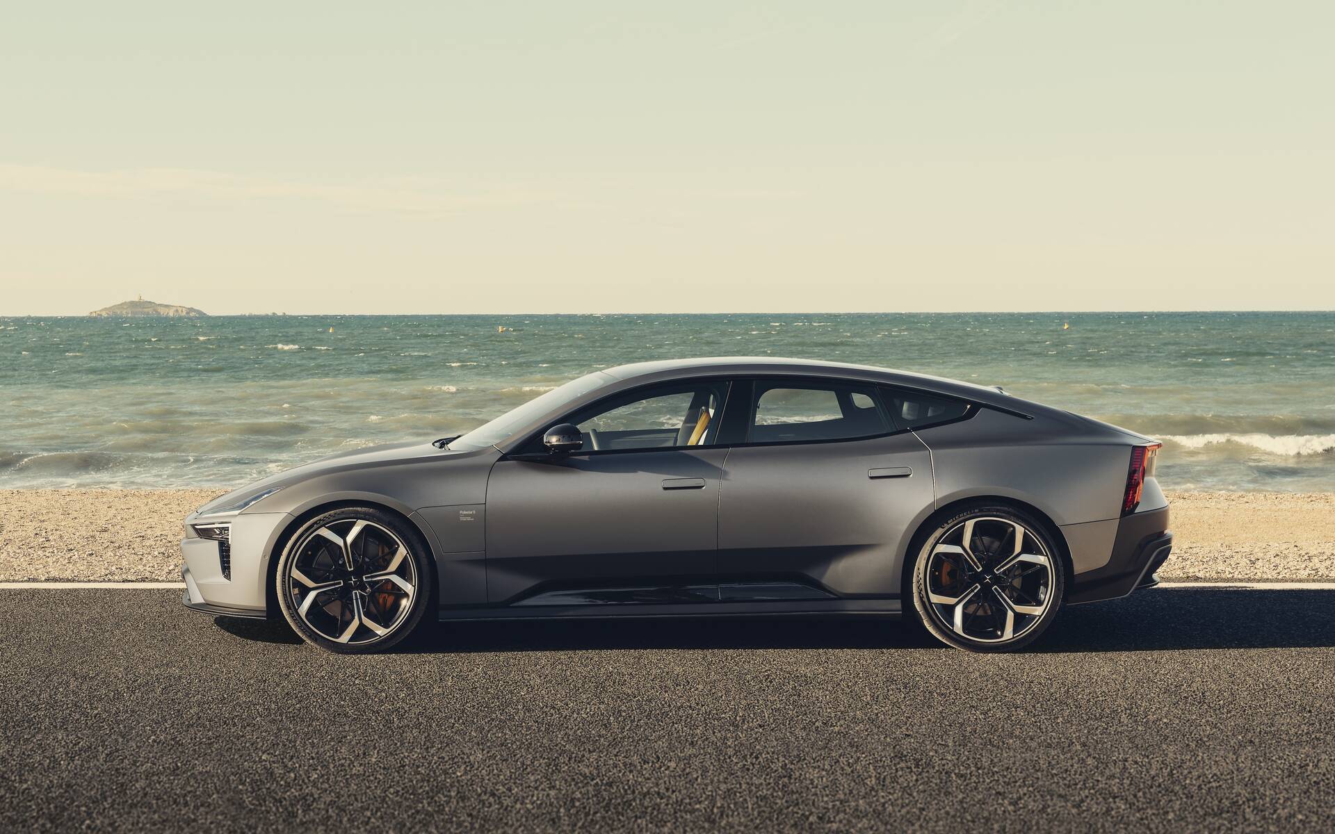 La vue de profil est particulièrement saisissante. Admirez la grande proximité entre la ligne du capot et les roues surdimensionnées (de 20 à 22 pouces selon la version), le sculptage très prononcé dans la partie inférieure des portières et la longue arche qui intègre le plus grand toit panoramique en verre jamais proposé sur un modèle Polestar (plus de 2 mètres de long et 1,25 mètre de large). En passant, le coefficient de traînée de seulement 0,24 valide les efforts consacrés à l’aérodynamisme.