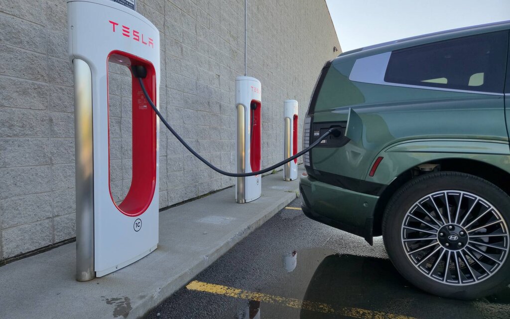 Nous avons profité du fait que le nouveau VUS électrique de Hyundai intègre un port NACS (un adaptateur CCS est fourni) pour le brancher à un Superchargeur de Tesla. L’opération est assez conviviale à l’aide de l’application mobile de Tesla, comme nous l’avons expliqué en détail à la suite d’un essai du Kia EV6. Sachez que ce ne sont pas tous les Superchargeurs qui sont compatibles. De plus, alors que la borne affichait une capacité de 250 kW, la puissance maximale extirpée par notre IONIQ 9, tout en restant constante, n’a pas dépassé 121 kW (en raison d’une différence de tension entre le système à 800 V du véhicule et celui à 400 V du Superchargeur). Ici, comptez plutôt une quarantaine de minutes pour passer de 10% à 80%.