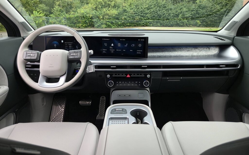 À bord, on découvre l’une des grandes forces du Hyundai IONIQ 9 2026, c’est-à-dire un habitacle ultra accueillant, silencieux, confortable et polyvalent. La présentation résolument moderne réunit un amalgame de matériaux de qualité et de textures qui rendent le décor plus dynamique, bien que l’habillage deux tons optionnel ne soit pas vraiment conseillé pour une famille en raison de ce gris très pâle qui se tache et s’abime aisément (notre exemplaire d’essai avec 6 000 km au compteur semblait avoir deux ans d’usure, sans trop exagérer). Vous êtes averti.