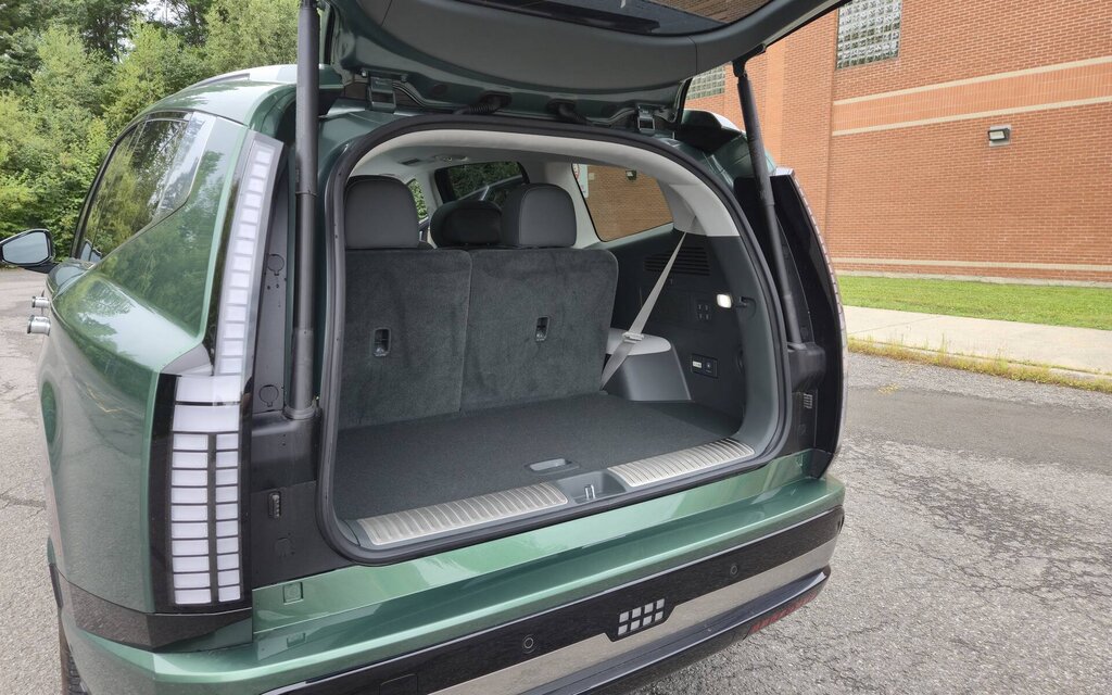 Pas trop dure et suffisamment dégagée, la troisième rangée peut accueillir des adultes ou ados de grandeur raisonnable au besoin, mais s’adresse d’abord à des enfants. Nos différents passagers ont pu l’attester. Pour ce qui est du chargement, il reste un gros 620 litres derrière, soit plus que dans le Palisade ou le Kia EV9, de quoi transporter sans réel problème les sacs d’épicerie d’une semaine. N’oublions pas le coffre sous le capot avant, qui donne 88 ou 52 litres selon le nombre de moteurs en présence et convient bien pour transporter câble de recharge, trousse d’urgence et quelques outils.